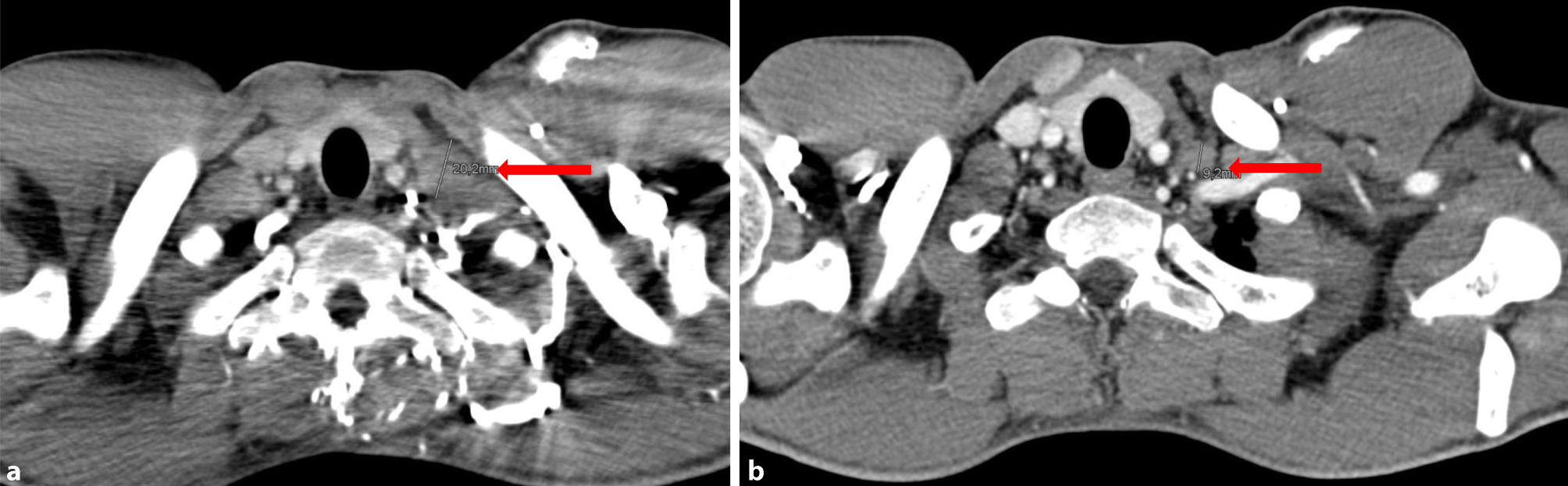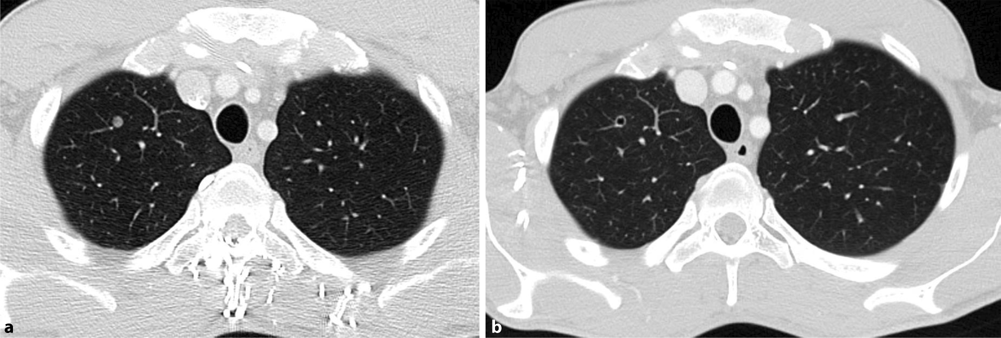 The patient received six cycles of palliative chemotherapy with docetaxel, cisplatin, 5‑fluorouracil (DCF) from June 2016 to October 2016 in a local hospital in Vienna. Although a partial response was seen after three cycles, the final CT scan exhibited progressive disease. Consequently, the hospital changed the treatment to pembrolizumab, which was given for three cycles every 3 weeks with a dose of 200 mg until January 2017. A subsequent restaging CT showed progressive disease; therefore, pembrolizumab was discontinued and no alternative treatment was given. Five months after discontinuation of the pembrolizumab treatment (June 2017), a new staging CT showed significant shrinkage of the metastases in Virchow’s triad (Fig. 1a, b), lung (Fig. 2a, b), liver (not shown), and lymph nodes (not shown). This spontaneous regression was remarkable, since the patient did not receive any treatment during this period.