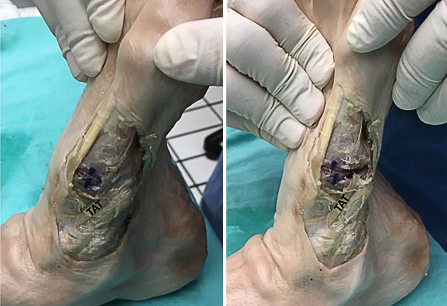 TMT‑1 appeared strained in all anatomic specimens (n = 6) when cross-glide test was performed (2.4 ± 0.5 mm). After TAT had been dissected on TMT‑1 level, TMT‑1 appeared significantly more unstable (4.2 ± 0.8 mm; p = 0.009) when testing was repeated (Fig. 2) indicating TAT to be an important structure in the clinical testing via cross-glide test.