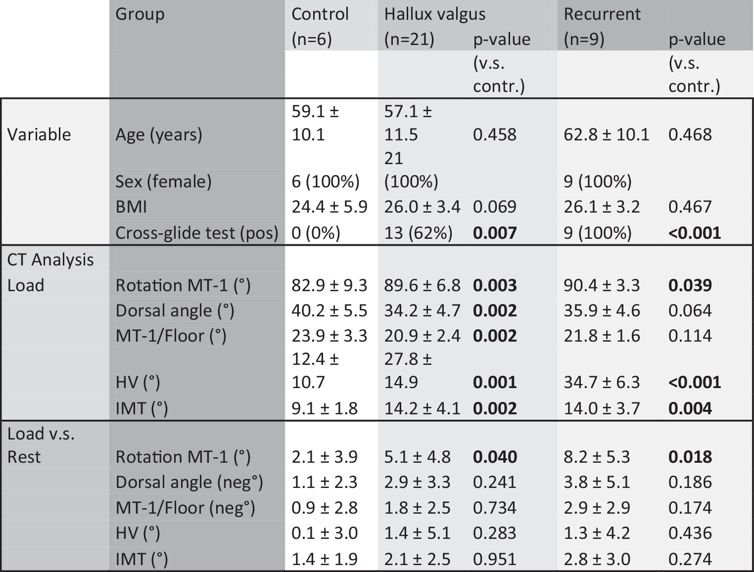 Comparison between healthy controls, hallux valgus and recurrent hallux valgus group concerning clinical data, simulated weight-bearing computer tomography (CT) analysis, and simulated weight-bearing CT analysis compared to non-weight-bearing CT analysis