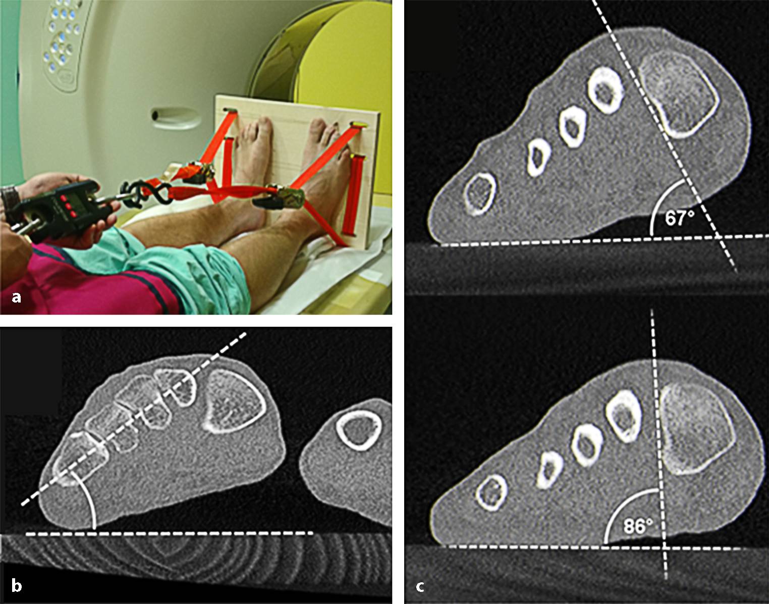 a Simulated weight-bearing computer tomography (CT) scan was performed on the loading device with the lower limbs extended and the ankle joint in a neutral position. Analysis of CT scans was performed measuring dorsal angle (b) and MT‑1 rotational angle as shown here in non-weight-bearing (c, upper) and weight-bearing position (c, lower) as earlier described [3, 11]
