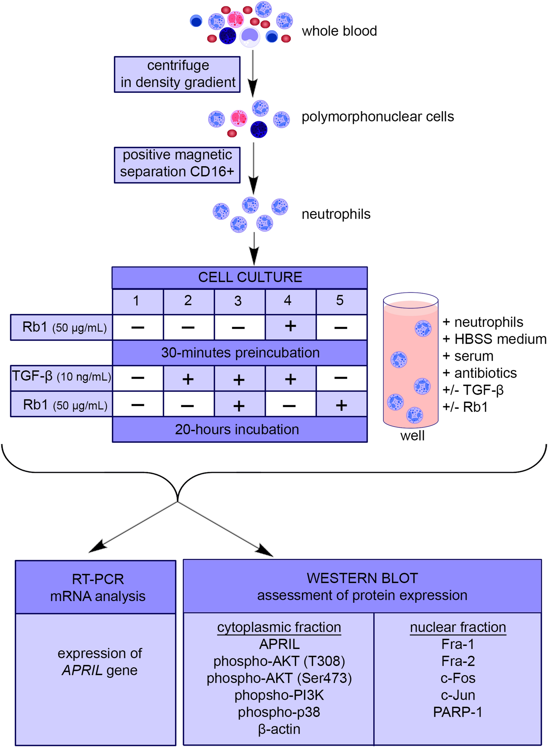 In summary, the study shows that in human neutrophils TGF-β activates the Akt and p38 kinases, and the transcription factors c-Jun, c-Fos and Fra-1, which may be involved in the regulation of APRIL synthesis. However, the Rb1 ginsenoside reduces the effect of TGF-β on APRIL production by resolving the cytokine signaling pathway. Ginsenoside Rb1 appears to be a favorable factor that may be potentially used in the modulation of tumor-promoting APRIL expression.