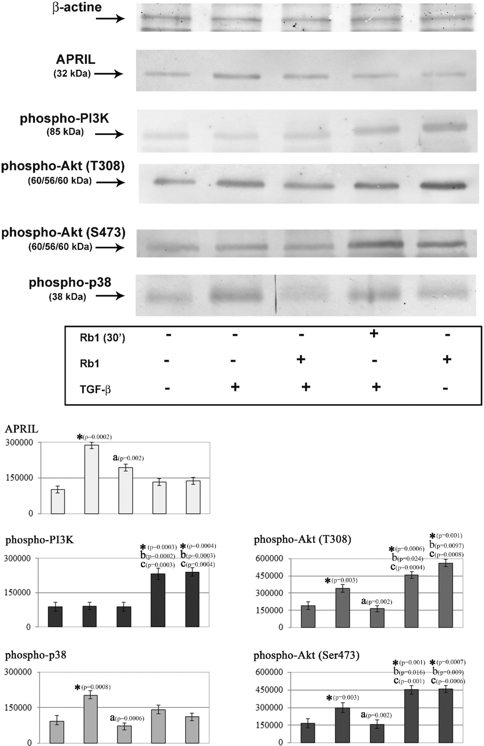 Representative western blots showing the expressions of APRIL, phospho-p38, phospho-PI3K, phospho-Akt(T308) and phospho-Akt(S473) in neutrophils. Neutrophils were treated with TGF-β (10 ng/ml) or with/without Rb1 (50 µg/ml). Cytoplasmic fractions obtained from those cells were used for assessment of APRIL, phospho-p38, phospho-PI3K, phospho-Akt(T308) and phospho-Akt(S473) protein levels via Western blot analyses. Band intensity was quantified using ImageJ software and expressed in arbitrary units (A.U.). Data shown are mean (± SE) of five independent experiments. Value significantly different between * unstimulated and stimulated cells (p < 0.05); a cells incubated only with TGF-β and cells incubated with TGF-β and Rb1 (p < 0.05); b stimulated cells and incubated only with TGF-β (p < 0.05); c stimulated cells and incubated with TGF-β and Rb1 (p < 0.05)