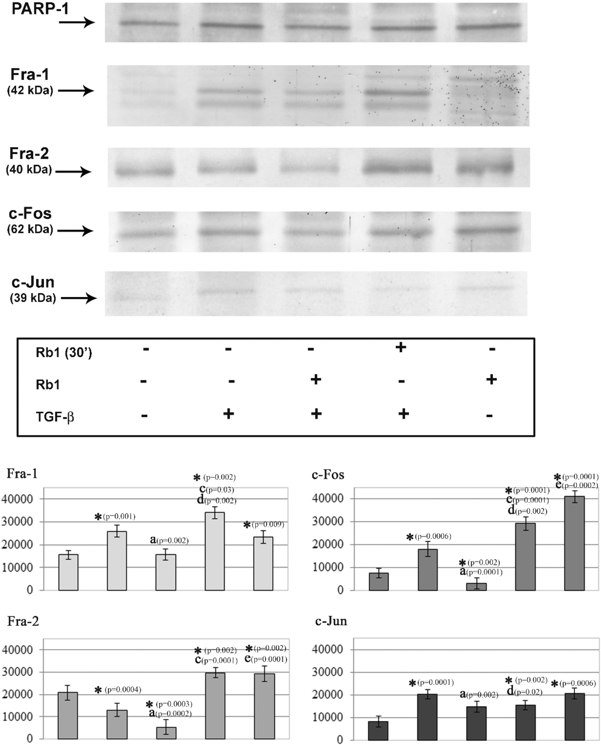 Representative western blots showing the expressions of Fra-1, Fra-2, c-Jun and c-Fos in neutrophils. Neutrophils were treated with TGF-β (10 ng/ml) or with/without Rb1 (50 µg/ml). The nuclear fractions obtained from those cells were used to detect for Fra-1, Fra-2, c-Jun and c-Fos protein levels by Western blot analyses. Band intensity was quantified using ImageJ software and expressed in arbitrary units (A.U.). Data shown are mean (± SE) of five independent experiments. Value significantly different between * unstimulated and stimulated cells (p < 0.05); a cells incubated only with TGF-β and cells incubated with TGF-β and Rb1 (p < 0.05); c stimulated cells and incubated with TGF-β and Rb1 (p < 0.05); d cells incubated only with Rb1 and cells incubated with Rb1 (30’) and TGF-β (p < 0.05); e cells incubated only with Rb1 and cells incubated only with TGF-β (p < 0.05)