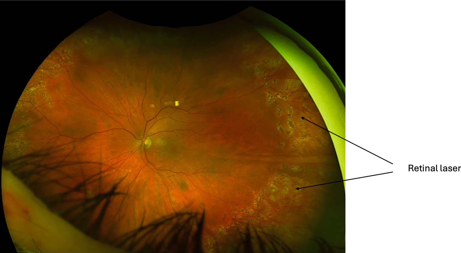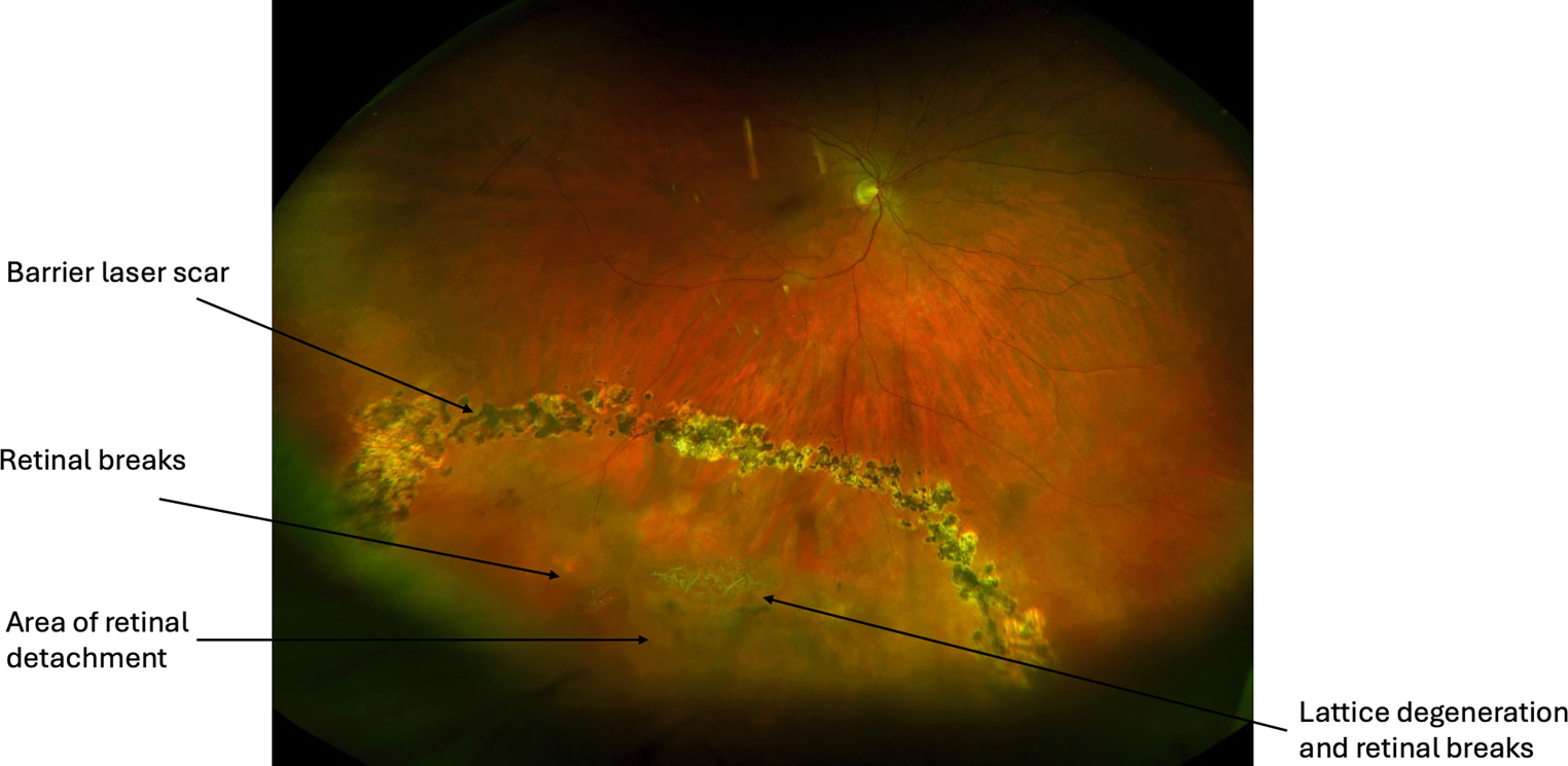 Inferior macula-sparing retinal detachment in a high myope with lattice degeneration and retinal breaks, barricaded by retinal laser