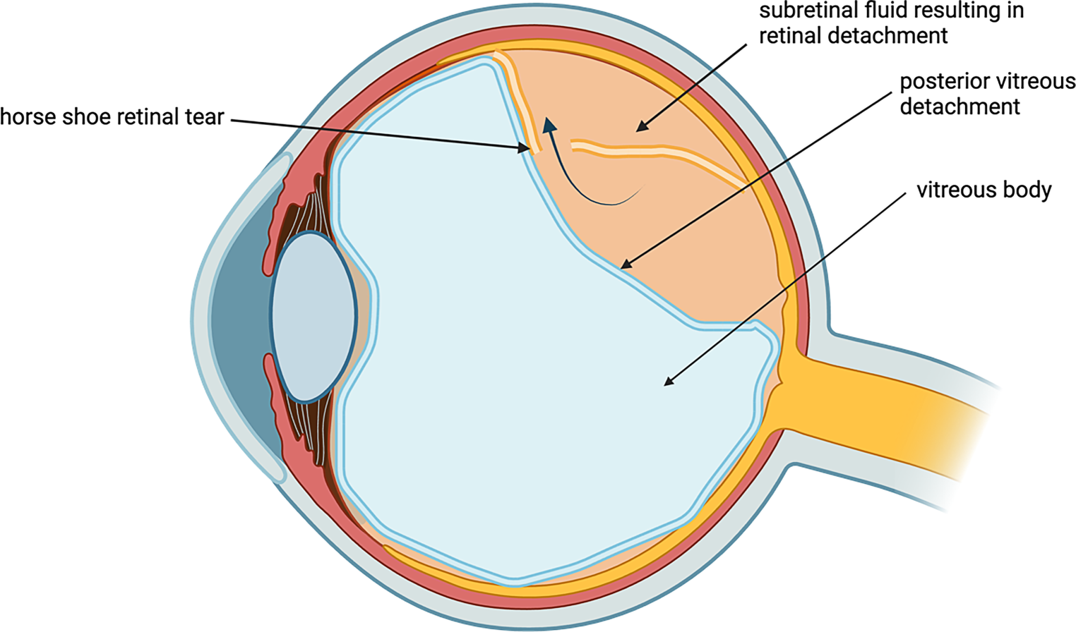 Posterior vitreous detachment generating traction, resulting in a retinal break and retinal detachment [11]