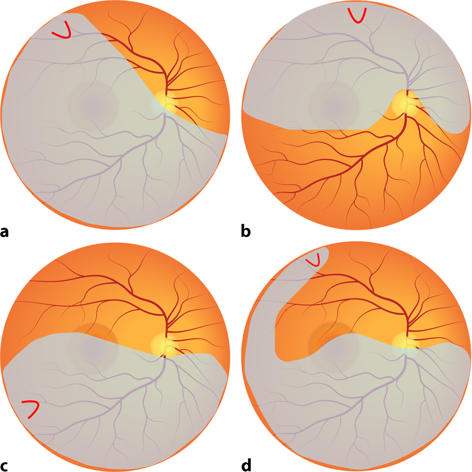 Summary of the Lincoff rules (blue = retinal detachment area and red = retinal break) a Superior temporal or nasal rhegmatogenous retinal detachment (RRD)—the primary break lies within 1.5 clock hours of the highest border; b total or superior RRD that crosses the 12 o’clock meridian—the primary break occurs at 12 o’clock or within 1.5 clock hours; c inferior RRD—the higher side of the detachment contains the break; d inferior bullous RRD—the primary break is usually a small hole close to 12 o’clock [11]