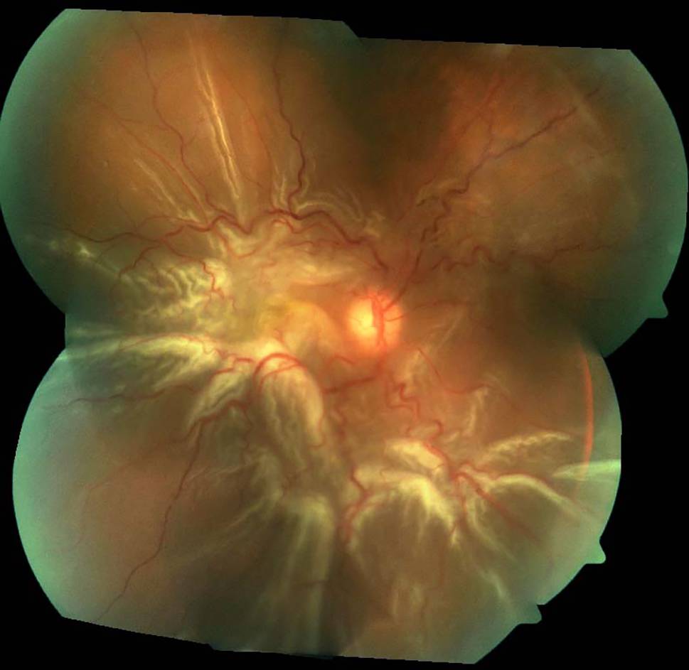 Colour fundus photograph of the right eye demonstrating proliferative vitreoretinopathy grade C retinal detachment with retinal star folds