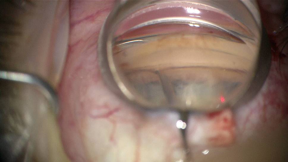 Catheter tip introduced into Schlemm’s canal. Tip location visible by red light shining through the trabecular meshwork