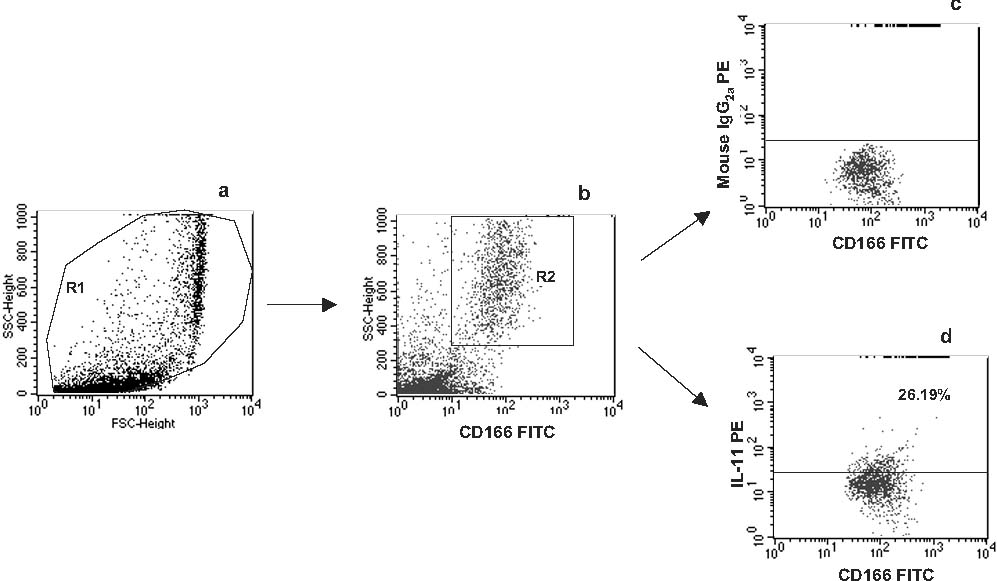 For the analysis of CD166+ cells staining for intracellular cytokine expression, four data parameters were acquired and stored: FSC, SSC, FL-1, and FL-2. An acquisition gate was established based on FSC and SSC (region R1; Fig. 2a). Then the R1-gated events were analyzed for CD166 FITC staining and positive cells (CD166+) were gated (R2; Fig. 2b). The dot plots CD166 FITC versus an isotype control (Fig. 2c) and CD166 FITC versus an appropriate anti-cytokine moAb PE (Fig. 2d) were established by combined gating of events using R1 and R2.
