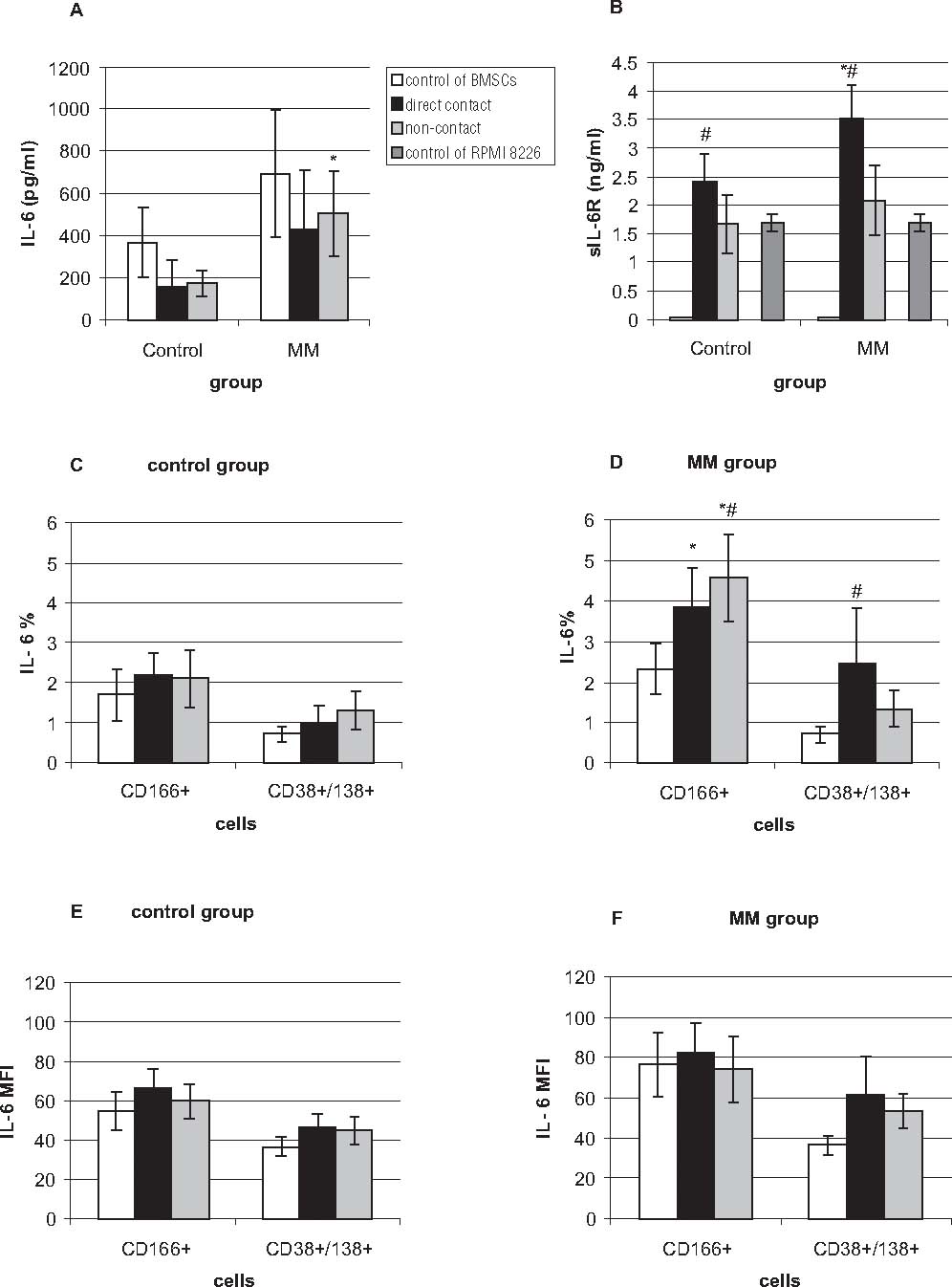 Production of IL-6 in cultures and co-cultures of BMSCs of MM patients and control subjects with RPMI8226 myeloma cells. Production of IL-6 was measured by ELISA (A) and by cytometric analysis in monocultures of CD166+ cells (markers for mesenchymal stromal fibroblasts), monocultures of CD38+/CD138+ myeloma cells, and in co-cultures where both types of cells were in direct cell-to-cell contact (direct) or were separated by a transwell (non-contact). The level of IL-6 expression was measured by flow cytometry as the percentage of IL-6-expressing cells (C, D) or as the MFI (E, F), indicating the level of IL-6 expression in cells. Moreover, production of sIL-6R was measured by ELISA (B). *Significantly different from the control group, p<0.05; #significantly different from monoculture within the group, p<0.05.
