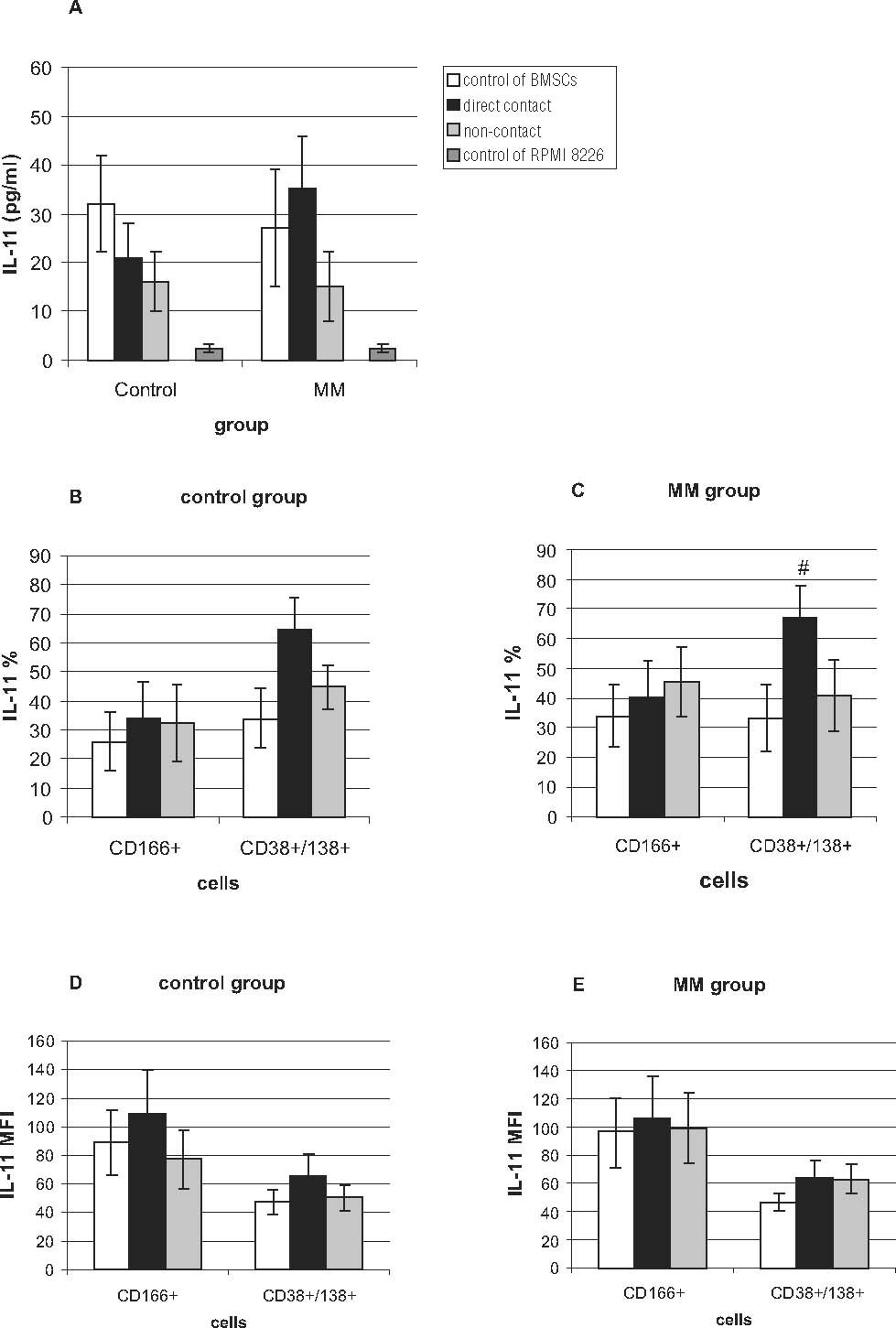 Production of IL-11 in cultures and co-cultures of BMSCs of MM patients and control subjects with RPMI8226 myeloma cells was measured by ELISA (A) or by cytometric analysis in monocultures of CD166+ cells (markers for mesenchymal stromal fibroblasts), monocultures of CD38+/CD138+ myeloma cells, and in co-cultures where both types of cells were in direct cell-to-cell contact (direct) or were separated by a transwell (non-contact). The level of IL-11 expression in cells was measured by flow cytometry as the percentage of IL-11-expressing cells (B, C) or as the MFI (D, E), indicating the level of IL-11 expression in cells. #Significantly different from monoculture within the group, p<0.05.