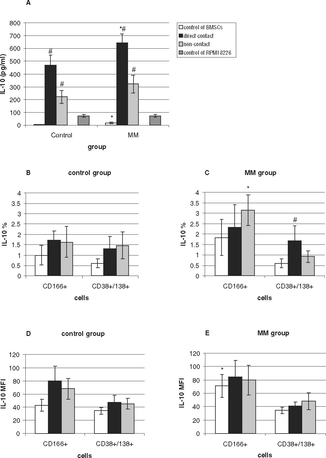 Production of IL-10 in cultures and co-cultures of BMSCs of MM patients and controls with RPMI8226 myeloma cells. Production of IL-10 was measured by ELISA (A) or by cytometric analysis in monocultures of CD166+ cells (markers for mesenchymal stromal fibroblasts), monocultures of CD38+/CD138+ myeloma cells, and in co-cultures where both types of cells were in direct cell-to-cell contact (direct) or were separated by a transwell (non-contact). The level of IL-10 expression was measured by flow cytometry as the percentage of IL-10-expressing cells (B, C) or as the MFI (D, E), indicating the level of IL-10 expression in cells. *Significantly different from control group, p<0.05; #significantly different from monoculture within the group, p<0.05.