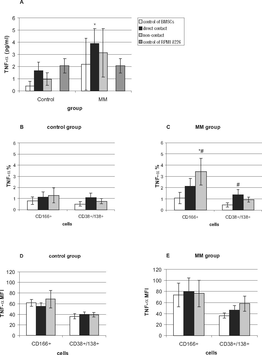 Production of TNF-α in cultures and co-cultures of BMSCs of MM patients and controls with RPMI8226 myeloma cells. Production of TNF-α was measured by ELISA (A) or by cytometric analysis in monocultures of CD166+ cells (markers for mesenchymal stromal fibroblasts), monocultures of CD38+/CD138+ myeloma cells, and in co-cultures, where both types of cells were in direct cell-to-cell contact (direct) or were separated by a transwell (non-contact). The level of TNF-α expression was measured by flow cytometry as the percentage of TNF-α-expressing cells (B, C) or as the MFI (D, E), indicating the level of TNF-α expression in cells. The level of TNF-α was also measured by ELISA (E). *Significantly different from the control group, p<0.05; #significantly different from monoculture within the group, p<0.05.
