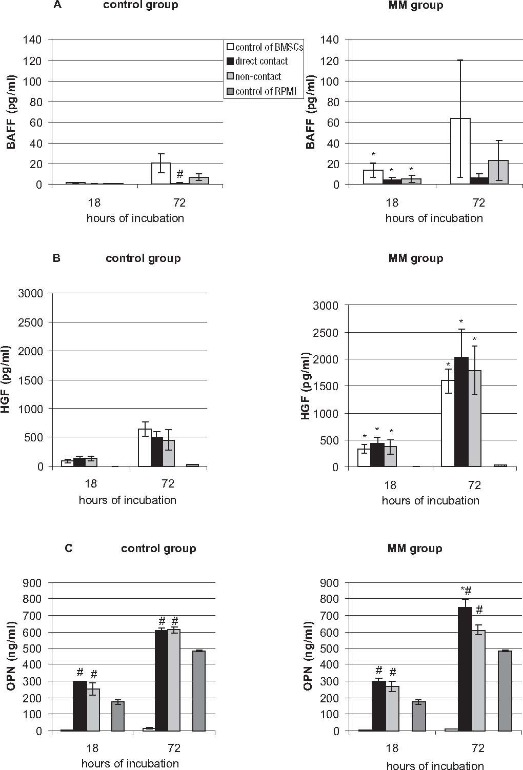 Production of BAFF (A), HGF (B), and OPN (C) in cultures of BMSCs of MM patients and control subjects and in co-cultures of both types of cells cultivated in cell-to-cell contact or in non-contact conditions, where the cells were separated by a transwell. The cytokine level was measured by ELISA in supernatants from the monocultures and co-cultures. *Significantly different from the control group, p<0.05; #significantly different from monoculture within the group, p<0.05.