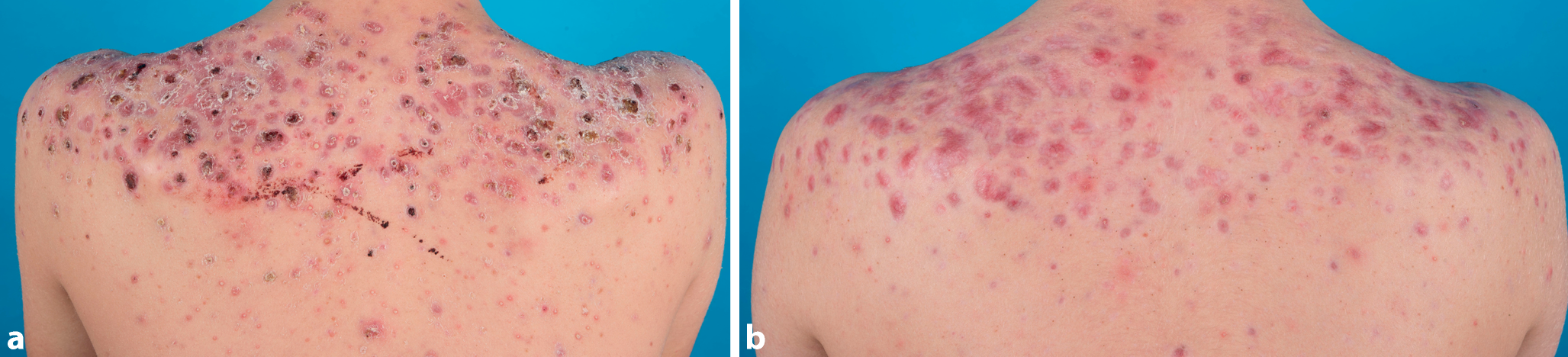 Bis zum Abklingen der akuten Symptome wird eine Pause der Isotretinoin-Therapie empfohlen; danach soll Isotretinoin wieder begonnen werden, allerdings in niedriger Dosierung mit 0,1 mg/kg/Tag. In der Praxis zeigt sich zumeist eine deutliche Verschlechterung der Akne bei Absetzen des Steroids, daher sollte je nach Klinik die Steroiddosierung vorsichtig und langsam reduziert werden: 10 mg von der Gesamtdosis/Tag weniger, nach 5–7 Tagen. Oft sind bis zu 12 Wochen Therapie nötig, was teilweise mit deutlichen Steroidnebenwirkungen für die jungen Patienten einhergeht. Bis dato gibt es keine alternativen Therapieempfehlungen zum Steroid. Abb. 1a zeigt einen 16-jährigen Patienten mit AF vor Beginn der Therapie, Abb. 1b zeigt ihn 4 Wochen später, unter Therapie mit Methylprednisolon und Isotretinoin.