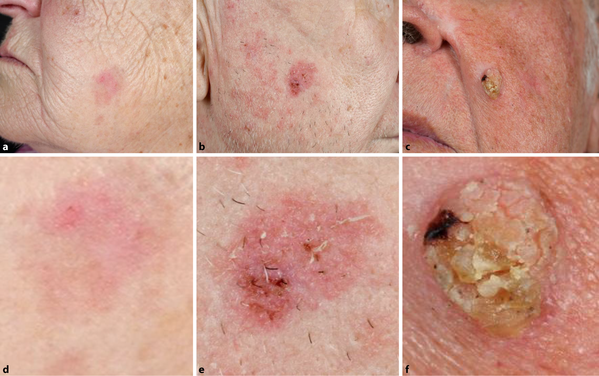 Klinische Einteilung der Schweregrade von aktinischen Keratosen nach Olsen: a, b Grad I: eine kaum sichtbare erythematöse Läsion. c, d Grad II: ein leicht erhabener, schuppender, unregelmäßig begrenzter erythematöser Herd. e, f Grad III: eine deutlich erhabene Läsion von höckeriger Gestalt mit derber Hyperkeratose; mittels kleiner Stanzbiopsie konnte ein PEK ausgeschlossen werden