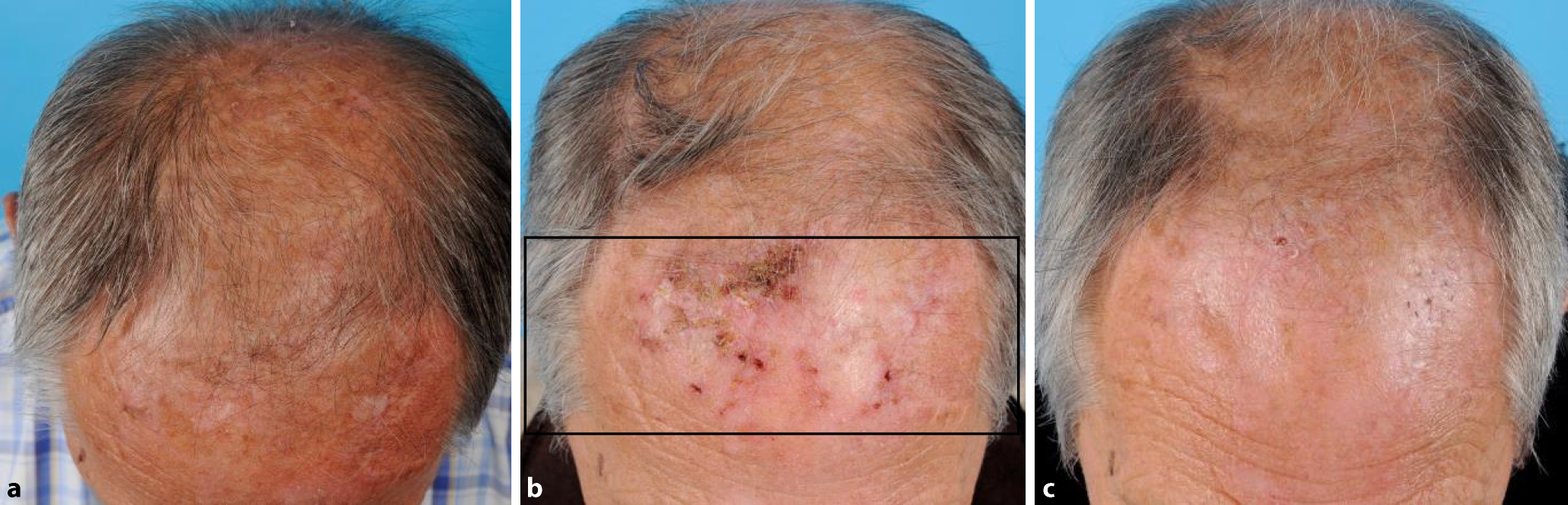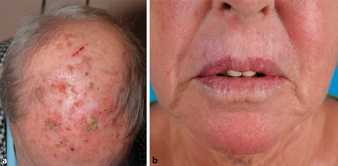 a Feldkanzerisierung: multiple aktinische Keratosen unterschiedlicher klinischer Grade am Capillitium, bei Zustand nach jahrelanger, intensiver UV-Exposition. b Aktinische Cheilitis: atroph veränderte, weißliche Lippenhaut bei stark ausgeprägter aktinischer Elastose; die Grenze zwischen Lippenrot und normaler Haut verläuft unscharf