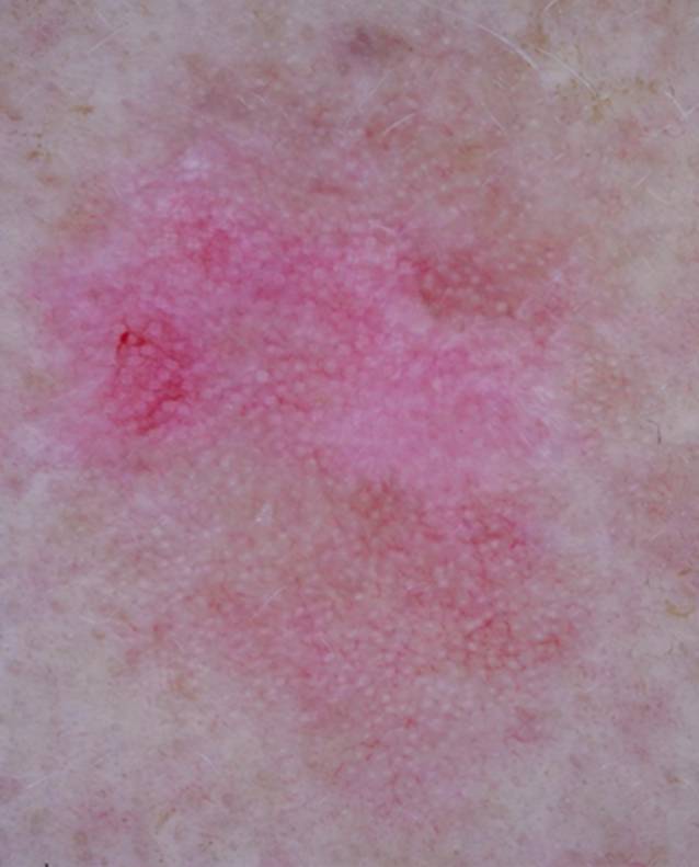 Die Diagnose einer AK wird primär klinisch gestellt, bei Verdacht auf Morbus Bowen oder PEK ist allerdings eine Stanzbiopsie angezeigt. Bei nicht eindeutigen Befunden können die Dermatoskopie, optische Kohärenztomographie (OCT) oder konfokale Lasermikroskopie (KLM) zusätzliche Informationen liefern, wobei natürlich die Dermatoskopie die kostengünstigste – und üblicherweise verfügbare – Methode darstellt. Dermatoskopisch sind nichtpigmentierte AKs meist durch ein Erdbeer-Muster („strawberry pattern“; Abb. 3) gekennzeichnet, womit das Bild von hellen, teils erhabenen follikulären Öffnungen vor erythematösem Hintergrund gemeint ist [33].