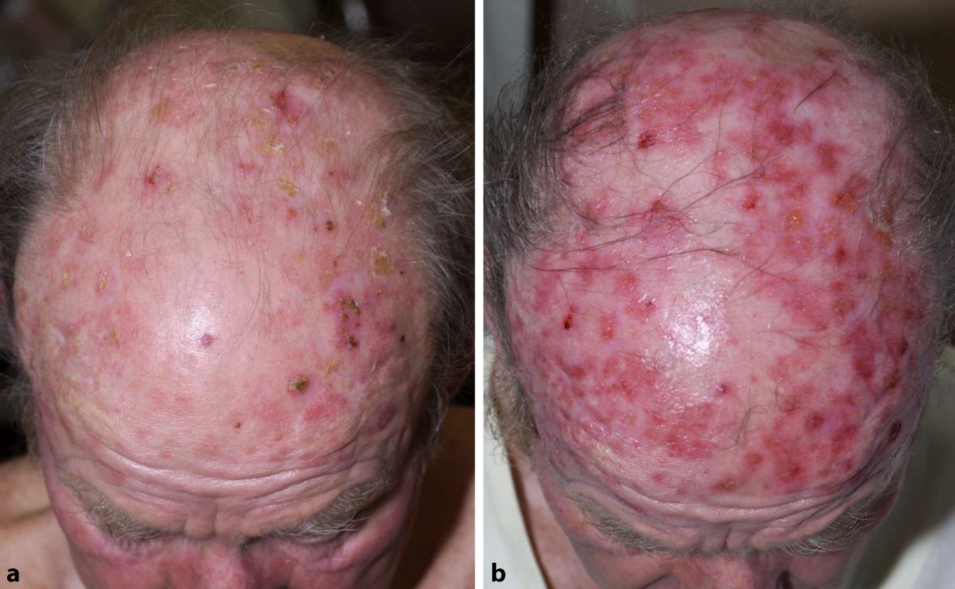 Innerhalb von Monaten bis Jahren werden fortgeschrittene AKs deutlich sicht- und tastbar. Die einzelnen Läsionen sind rötlich, erhaben und nach peripher an Größe zunehmend (AK Grad II, Abb. 1c, d). Olsen Grad III (Abb. 1d, e) bezeichnet AKs von unregelmäßiger höckeriger Gestalt mit fest haftenden Hyperkeratosen. Werden diese entfernt, zeigt sich ein erosiver Untergrund. Sind großflächige Hautareale, wie z. B. die gesamte unbehaarte Kopfhaut betroffen, liegt eine sogenannte Feldkanzerisierung vor (Abb. 2a).