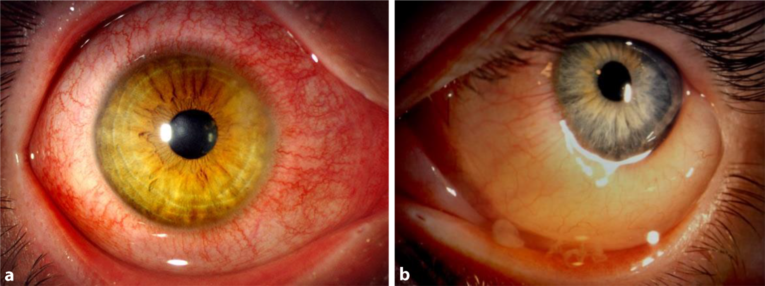 Klinische Zeichen einer SAC/PAC – a konjunktivale Hyperämie/Injektion, b Chemose