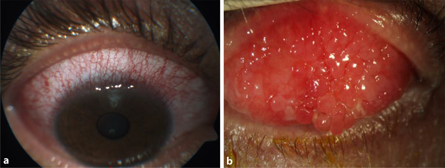Klinische Zeichen einer VKC – a gelatinöse Verdickungen am superioren Limbus, b subtarsale Papillen
