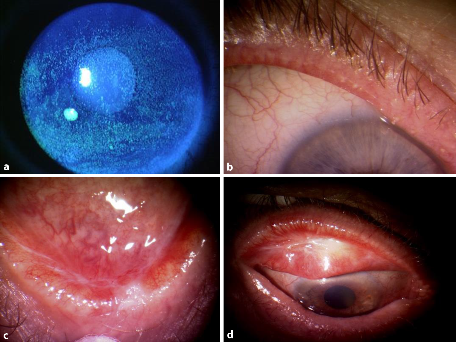 Klinische Zeichen einer AKC – a Korneale Stippung; b Meibom-Drüsen-Dysfunktion, Blepharitis; c Symblepharon; d subtarsale Fibrosen