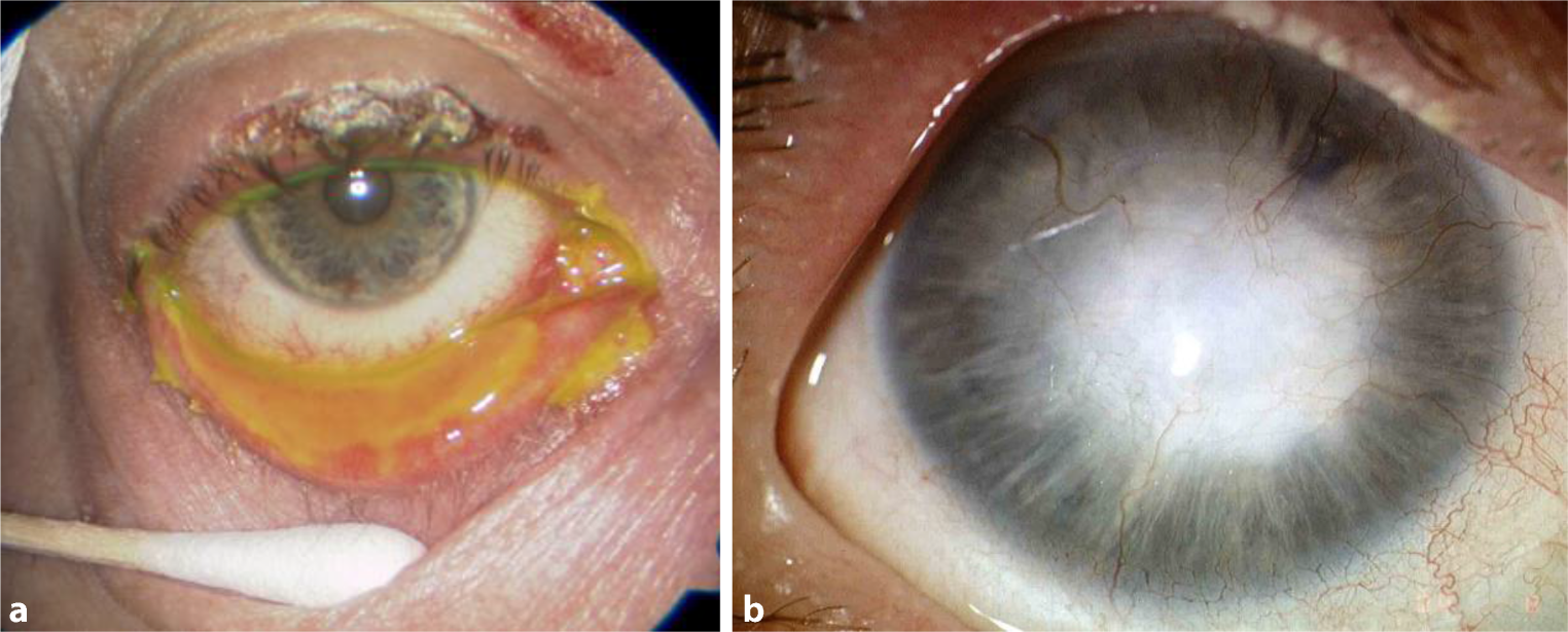 Okuläre Manifestationen bei SJS/TEN – a Akutstadium mit Blepharitis, Konjunktivitis und subtarsalen Pseudomembranen; b schlechtestes Outcome im chronischen Stadium mit Limbusstammzellinsuffizienz, Vernarbung der Augenoberfläche bis zur Erblindung