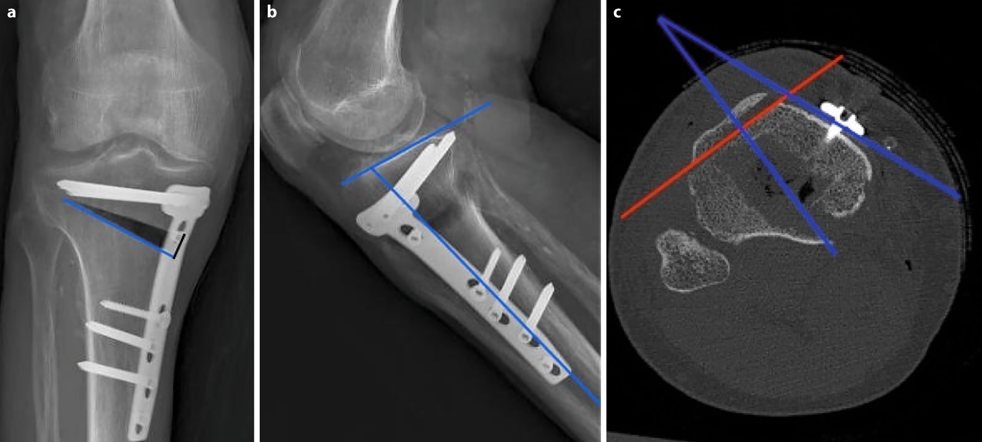 Measurement techniques on length of osteotomy (blue line) and medial osteotomy width (black line) are displayed in picture a; measurement technique of tibial slope and osteotomy slope (blue lines) are shown in picture b. In axial CT sequences, rotational offset of the plate (referring to the tibial tuberosity) was measured (red lines) (c)