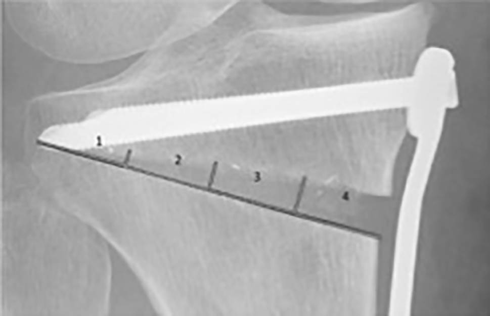 When applying the X‑ray technique optimized in the cadaver (30° of flexion and 25° of internal rotation of the knee joint), 21 out of 36 X‑rays showed exact visualization of the osteotomy gap (Fig. 6).