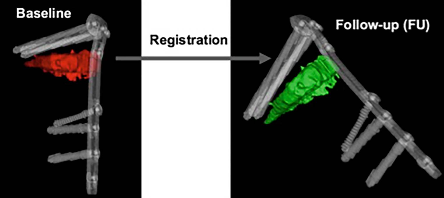 The osteotomy wedge is segmented manually at baseline (red) and registered automatically at follow-up (green) examinations using the plate and screws as reference points
