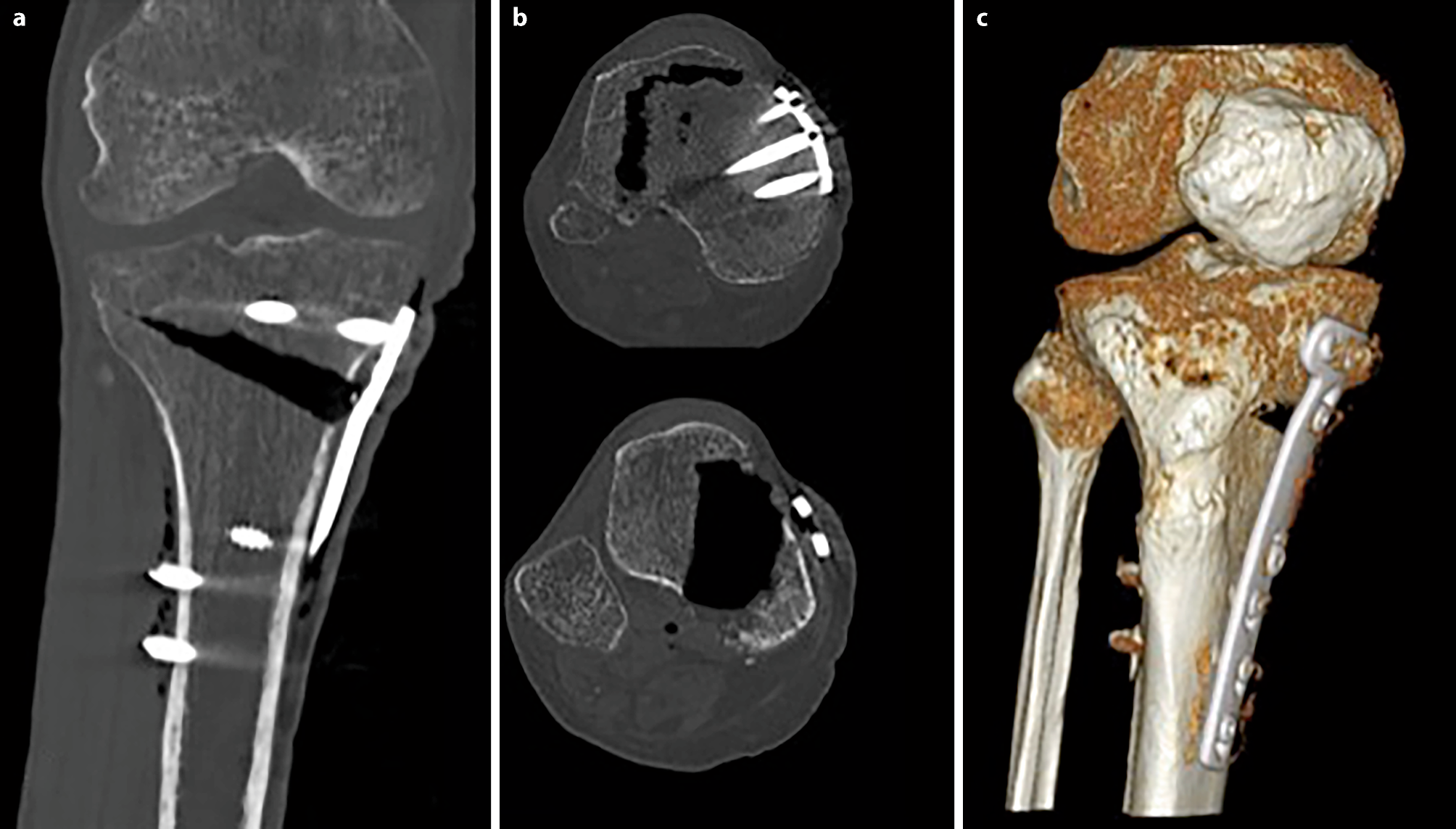 CT scans of cadaveric leg can bypass the obstacle of the overlap of the tibial tuberosity into the osteotomy gap (a shows an AP section image, b shows an axial section image and c shows a 3D reconstruction)