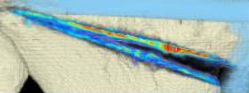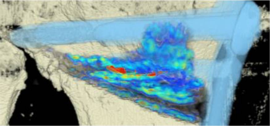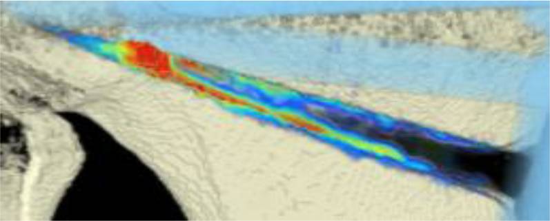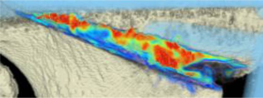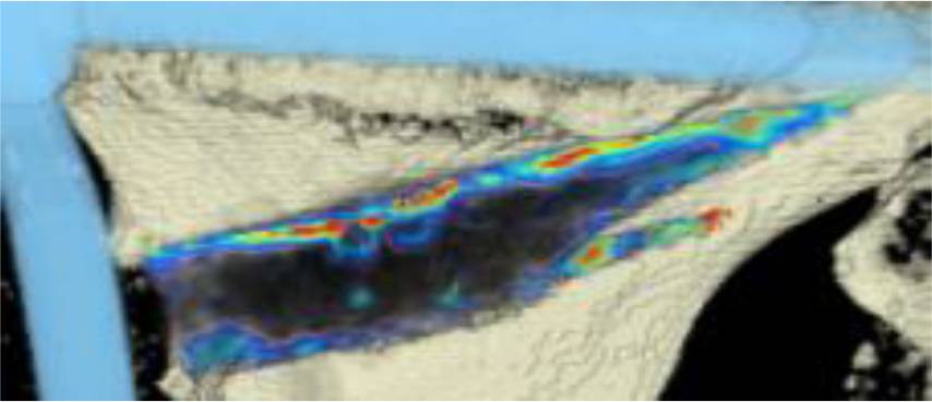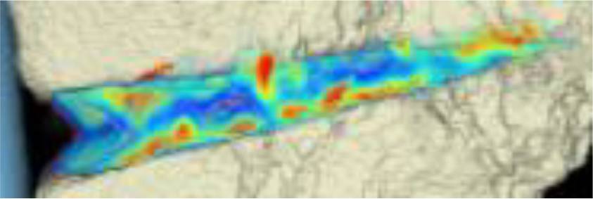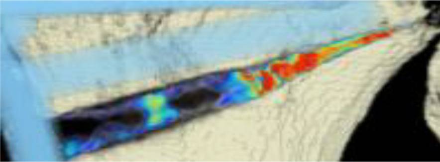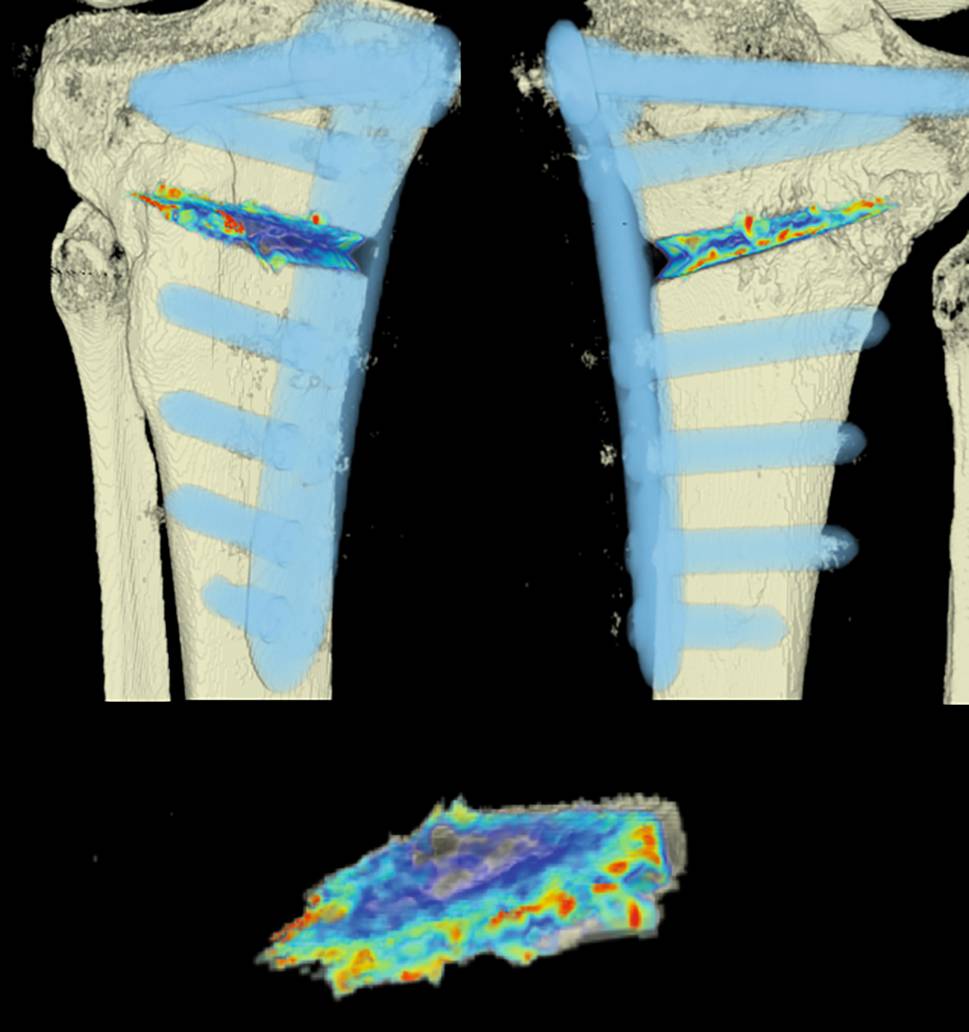 CT scan analysis included a visualization of the highest BMD changes: the gap is evenly filled with new bone; red zones mark the areas with most bone growth, green zones moderate bone growth and blue areas show only minimal changes in BMD