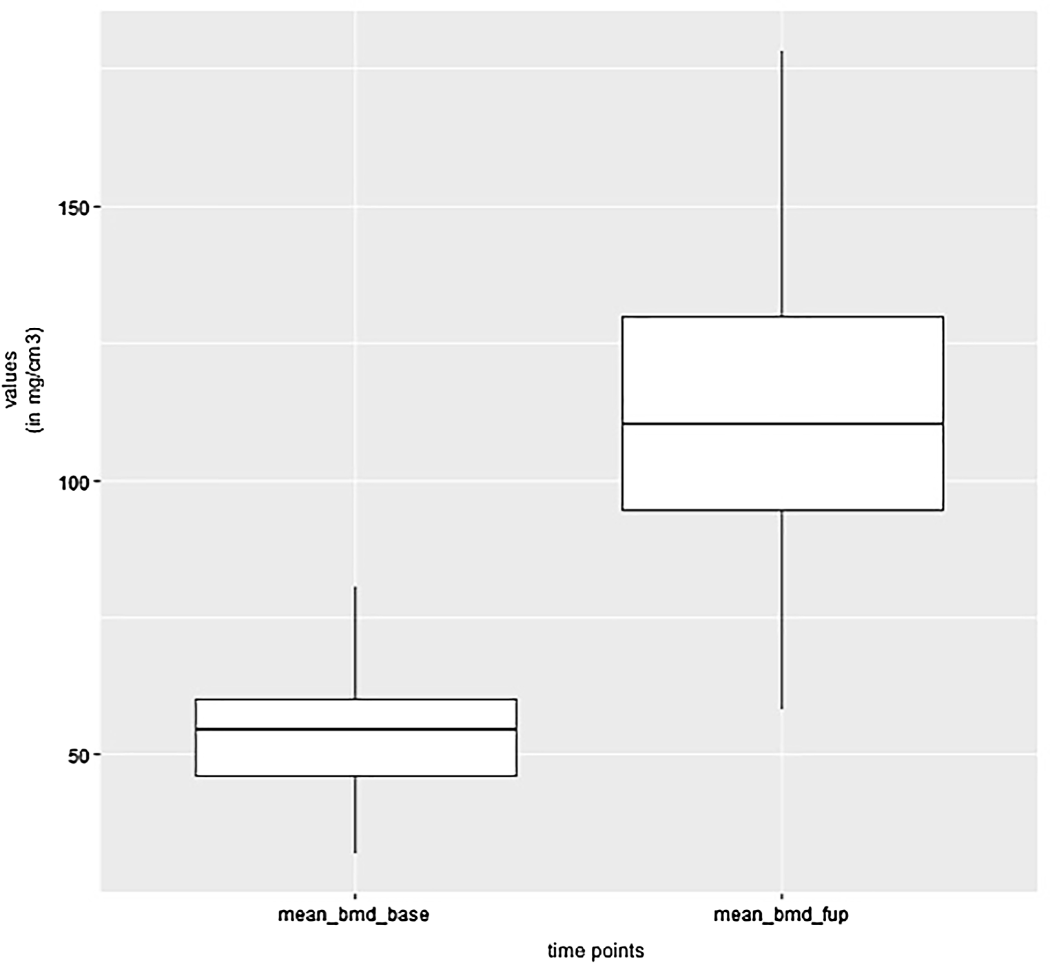 Mean BMD measurement values in Hounsfield units (HU) at baseline and follow-up; p < 0.0002. Visualization of changes in BMD for each patient are displayed using color coding (red = high bone growth, green = moderate bone growth, blue = low bone growth)