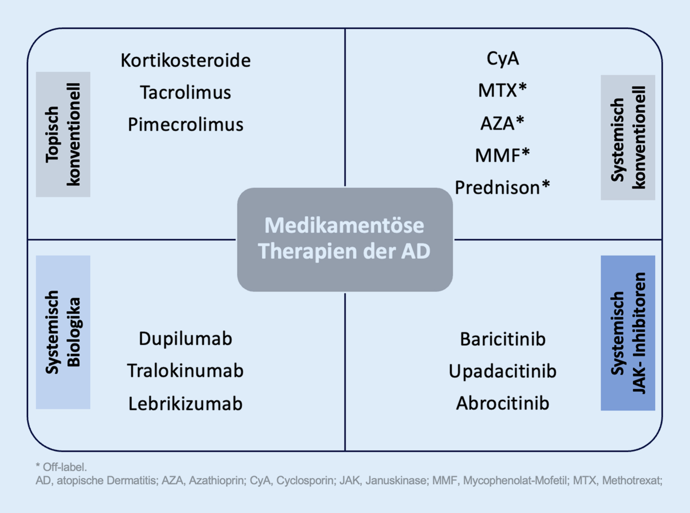 Medikamentöse Therapie der atopischen Dermatitis. (Asterisk off-label; AD atopische Dermatitis, JAK Januskinase, CyA Cyclosporin, MTX Methotrexat, AZA Azathioprin, MMF Mycophenolat-Mofetil)