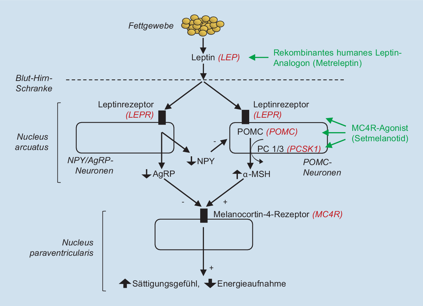 Schematische Darstellung des hypothalamischen Leptin-Melanocortin-Signalwegs. Das Hormon Leptin wird überwiegend vom Adipozyten freigesetzt. Durch die Blut-Hirn-Schranke erreicht Leptin Neuropeptid-Y-/Agouti-related-Peptid(NPY/AgRP)-Neuronen sowie Proopiomelanocortin(POMC)-Neuronen im Nucleus arcuatus des Hypothalamus. NPY/AgRP- und POMC-Neuronen regulieren, mit gegenseitigem Effekt, Melanocortin-4-Rezeptor (MC4R) exprimierende Neuronen im hypothalamischen Nucleus paraventricularis. MC4R-Neuronen erregen wiederum das Sättigungsgefühl und reduzieren die Nahrungsaufnahme. In POMC-Neuronen wird aus POMC durch das Enzym Prohormon-Convertase 1/3 (PC1/3) das α‑Melanozyten-stimulierende Hormon (α-MSH) erzeugt, welches den Rezeptor MC4R stimuliert. Im Gegensatz dazu, wird der Rezeptor MC4R von AgRP aus den AgRP-Neuronen gehemmt. Die Mutationen, auf welche die bekanntesten monogenen Adipositasformen zurückzuführen sind, betreffen die Gene (in rot angezeigt) für Leptin, den Leptinrezeptor, Proopiomelanocortin, das Enzym PC1/3, und MC4R. Therapiemöglichkeiten sind in grün dargestellt