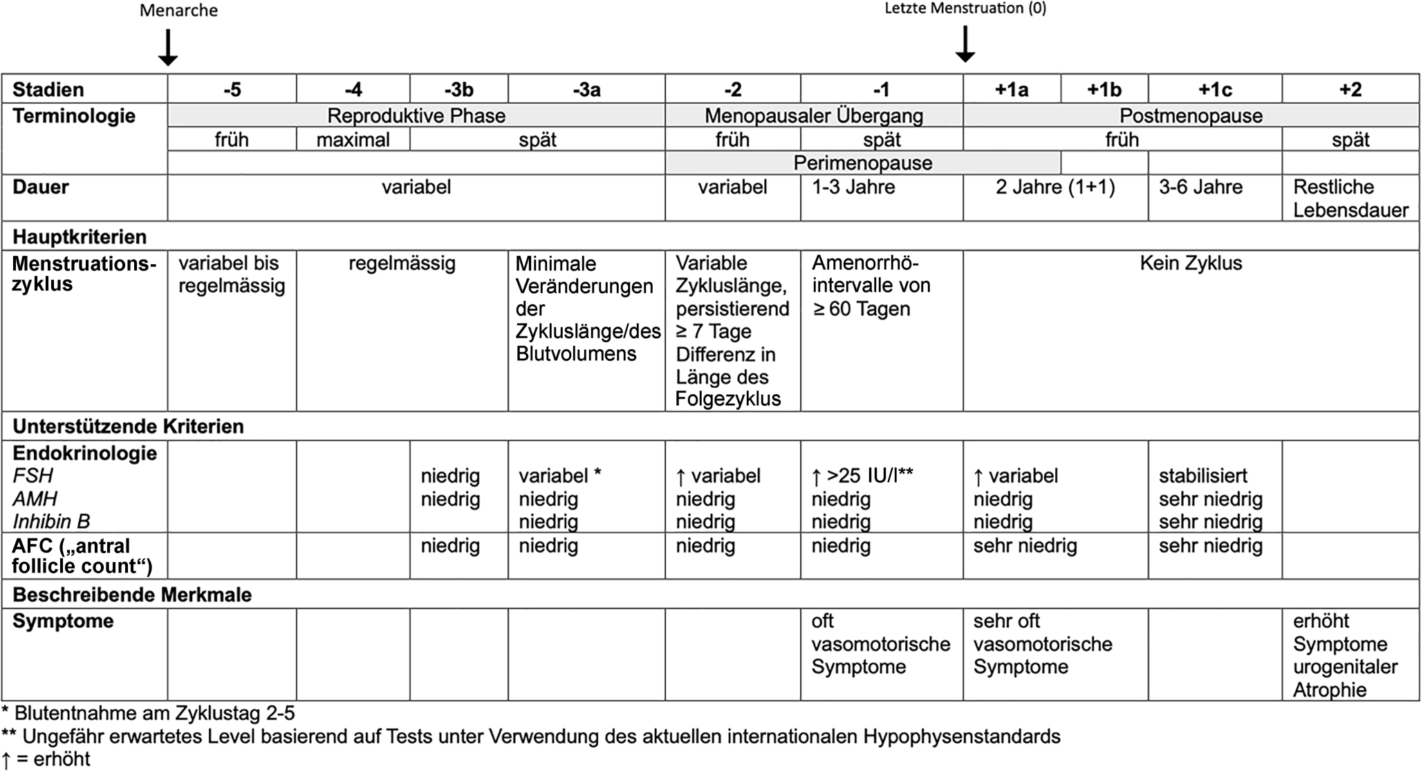 Das endokrine Altern wird nach Harlow 2012, STRAW +10 (Stages of Reproductive Aging Workshop) in verschiedene Stadien eingeteilt [2]. Wie in Abb. 1 ersichtlich, unterteilt STRAW +10 das erwachsene Frauenleben in drei Hauptphasen: die reproduktive Lebensphase, die menopausale Transition und die Postmenopause [2].