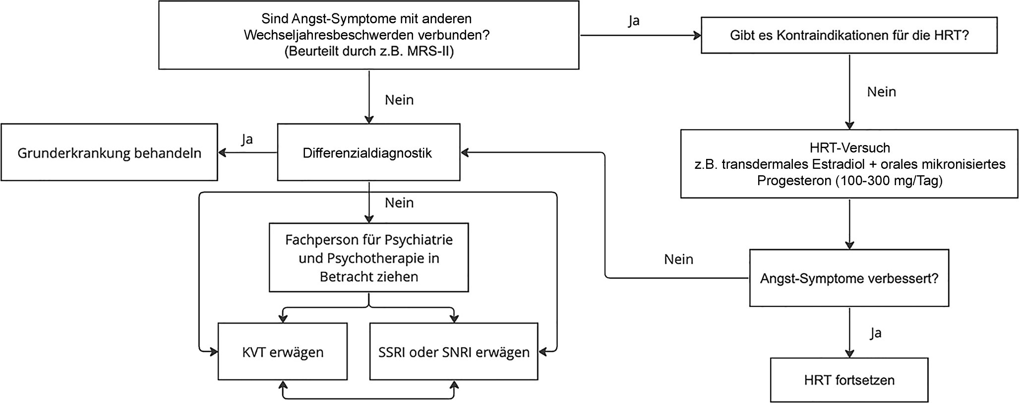 In Abb. 2 ist ein Ablauf zur Behandlung von Frauen in den Wechseljahren mit Angstsymptomen dargestellt. Zuerst werden die Wechseljahresbeschwerden mit Angstsymptomen z. B. mit der Menopause Rating Scale II (MRS-II) zur Evaluation der Wechseljahressymptome beurteilt. Wenn sowohl Angstsymptome als auch andere Wechseljahresbeschwerden vorliegen sowie keine Kontraindikation für eine Hormonersatztherapie besteht, kann eine solche für drei Monate durchgeführt werden. Das bevorzugte HRT-Schema beinhaltet transdermales Östradiol in Kombination mit sequenziellem oder kontinuierlichem oralem Progesteron in einer Dosierung von 100 bis 300 mg/Tag. Die kontinuierliche Einnahme bringt den Vorteil von Schlaf und Beruhigung, während die sequenzielle Behandlung bei Blutungsstörungen eine Alternative bietet [13].