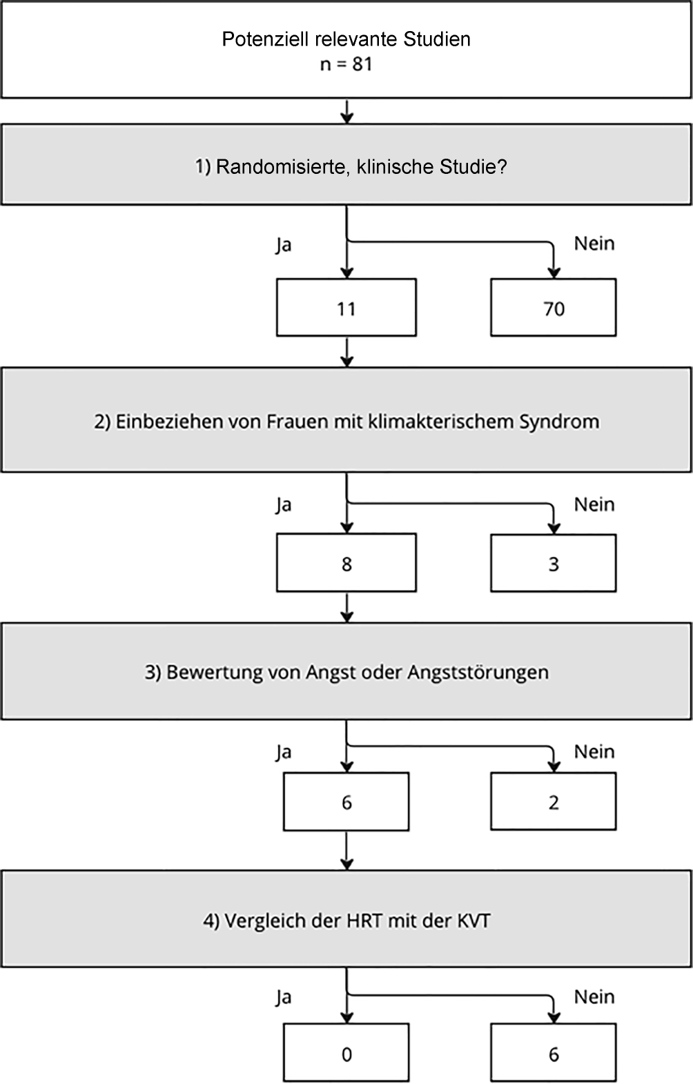 Es wurden (1) randomisierte, kontrollierte Studien (RCT) in Betracht gezogen, wenn sie folgende Kriterien erfüllen: (2) Einbeziehen von Frauen mit klimakterischem Syndrom, (3) Bewertung von Angst oder Angststörungen, (4) Vergleich der Hormonersatztherapie und der kognitiven Verhaltenstherapie.