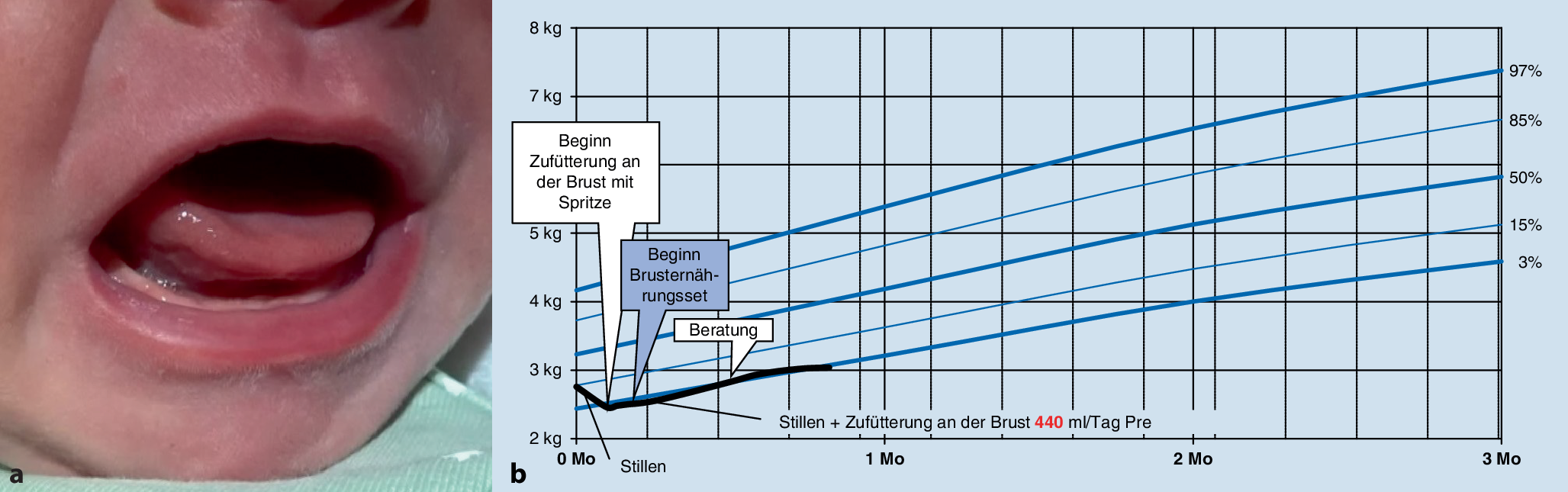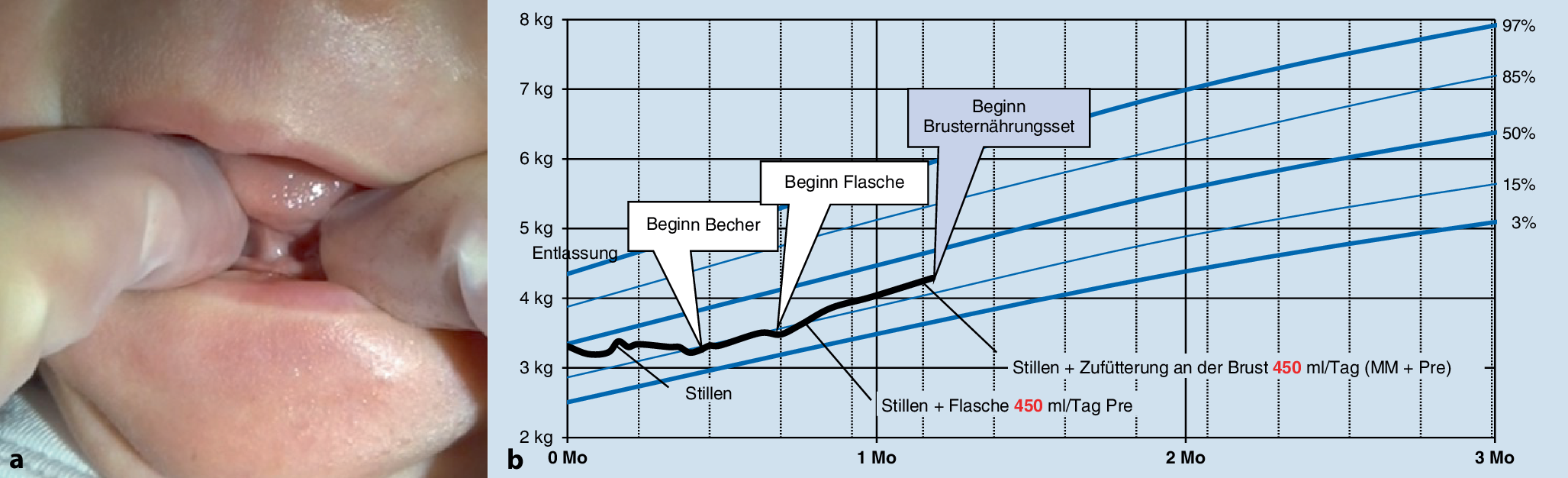 Multifaktorielles Beurteilungskonzept mit Zungenband-TOOL, Screeningbogen zur Funktion des Zungenbands, Gewichtskurve von Guóth-Gumberger und Karall