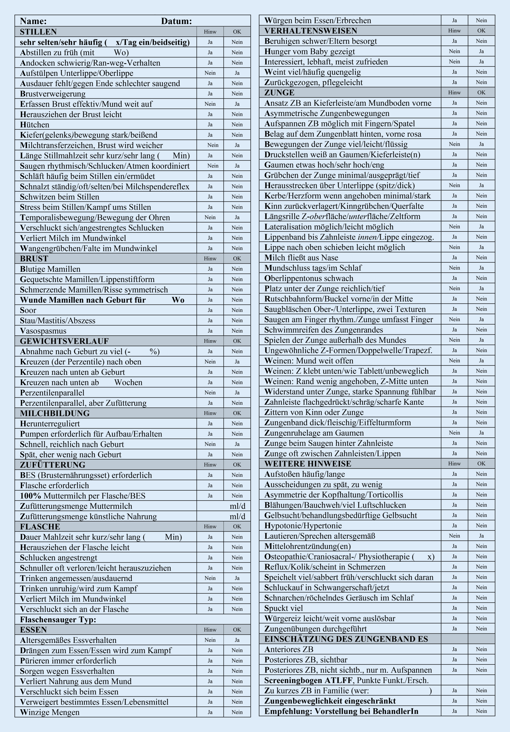 Zur Dokumentation des multifaktoriellen Beurteilungskonzepts verwenden wir neben dem ATLFF das Formular Zungenband-TOOL Baby [13] Abb. 3. Es enthält eine sehr umfassende Fragenliste nach möglichen Symptomen bei einer eingeschränkten Zungenbeweglichkeit. Die Antworten mit Ja und Nein können in 2 Spalten oder in der Mitte dazwischen eingekreist werden, die linke enthält die Hinweise auf eine Einschränkung, die rechte bestätigt eine normale Funktion. Es ist möglich, Zutreffendes zu unterstreichen, sehr auffällige Beobachtungen herauszuheben und im Fall einer Weiterverweisung das ausgefüllte Formular zusammen mit einer kurzen Zusammenfassung der Gesamtsituation an den Behandler, die Behandlerin zu schicken. Nach einer eventuellen Behandlung können veränderte Befunde in einer anderen Farbe eingetragen werden.