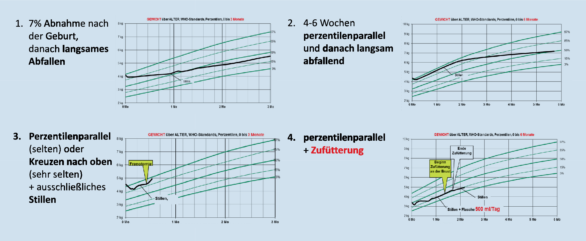Bei den komplexen und grenzwertigen Fällen vertreten wir die Meinung, dass es notwendig ist, den Gewichtsverlauf, die Zufütterung, die Gesamtsituation und weitere Kriterien einzubeziehen und individuell zu entscheiden und zu begleiten.