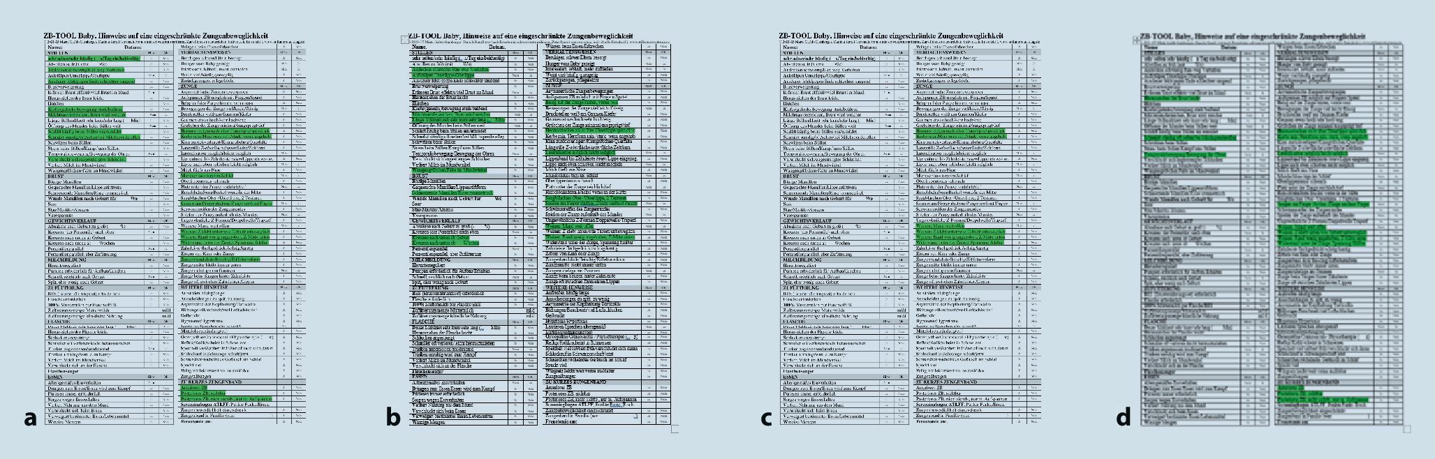 Was erfassen die verschiedenen Beurteilungsbögen? In Abb. 6 wurden die Kriterien, die die einzelnen Beurteilungsbögen erfassen, im Zungenband-TOOL grün unterlegt. Daraus wird ersichtlich, dass jedes diagnostische Tool unterschiedliche Kriterien erfasst.