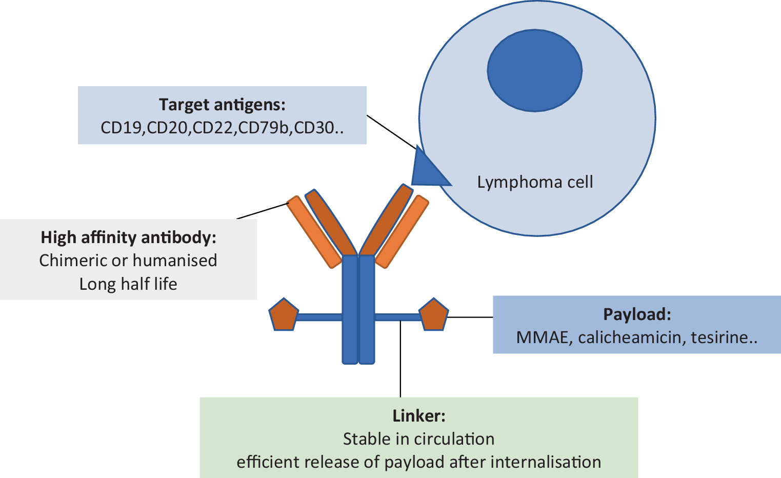 Chemotherapy represents an essential therapeutic option for the treatment of various forms of lymphoid malignancies. However, due to their nonspecific mode of action, these agents are usually associated with dose-limiting toxicities and ultimately drug resistance. With the development of monoclonal antibodies (mAb), a novel technology called antibody–drug conjugate (ADC), comprising a mAb linked to a small cytotoxic molecule via a covalent linker (Fig. 1), has emerged as a novel class of promising immunotherapy, presumably because of their high potency combined with high tumor selectivity. Once attached to the corresponding cell-surface antigen of tumor cells, the ADC is internalized, the cytotoxic payload is released, causing cell apoptosis.