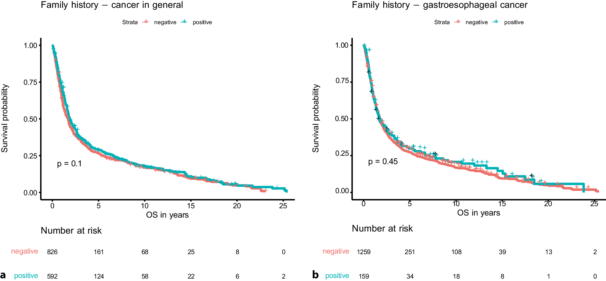 Family history in general on its own was not associated with OS (negative (n = 826): median 20.6 months (95% CI 17.6–22.2 months); positive (n = 592): median 23.3 months (95% CI 20.9–26.7 months); p = 0.10) and neither was family history of gastroesophageal cancer (negative (n = 1259): median OS 21.6 months (95% CI 20.1–23.2 months); positive (n = 159): median 21.0 months (95% CI 16.7–32.3 months); p = 0.45) (see Fig. 1).