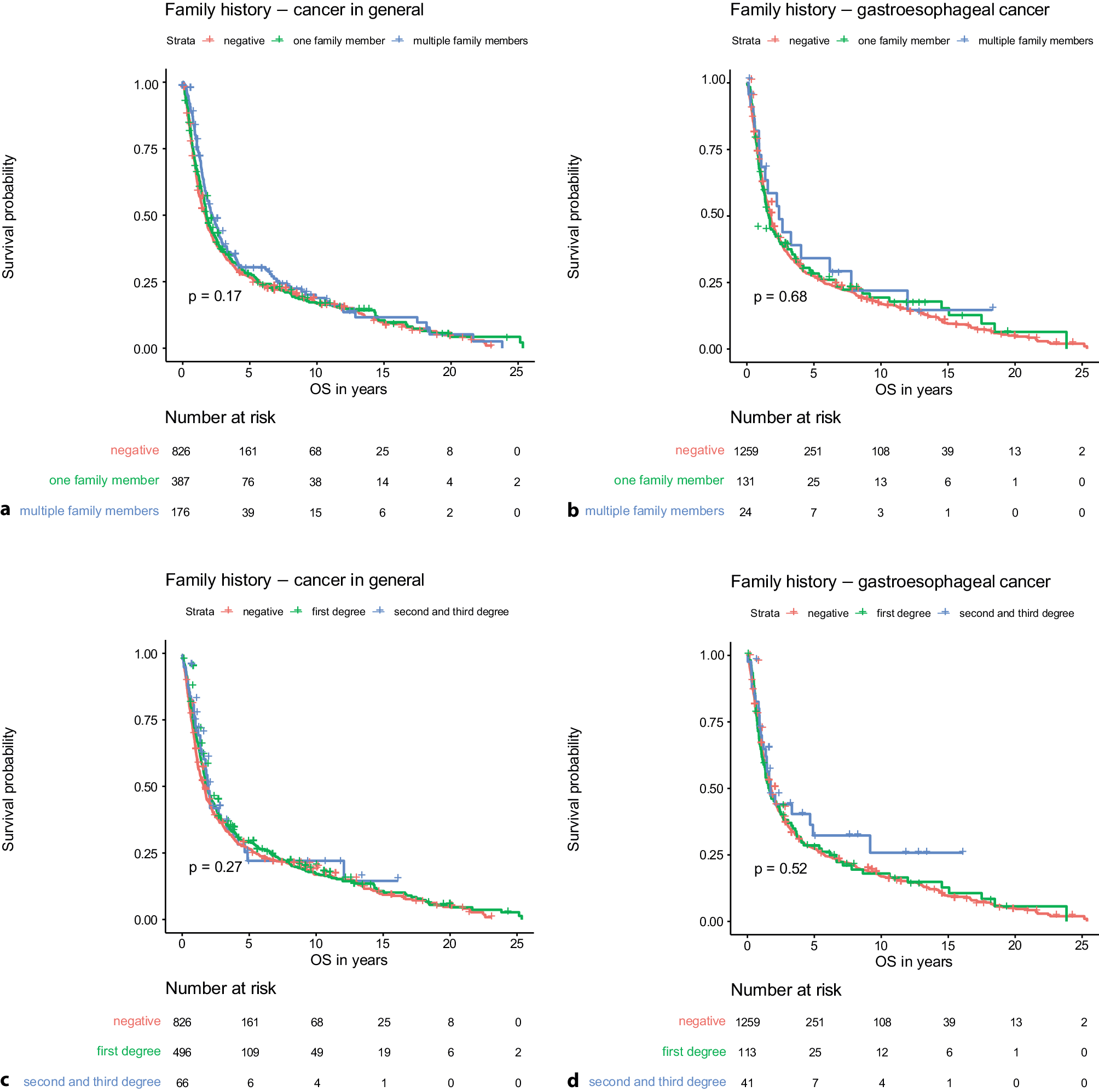 Overall survival depending on number of positive family members in patients with positive family history of cancer in general (a) and gastroesophageal cancer (b). Overall survival depending on degree of relatives with positive family history of cancer in general (c) and gastroesophageal cancer (d)