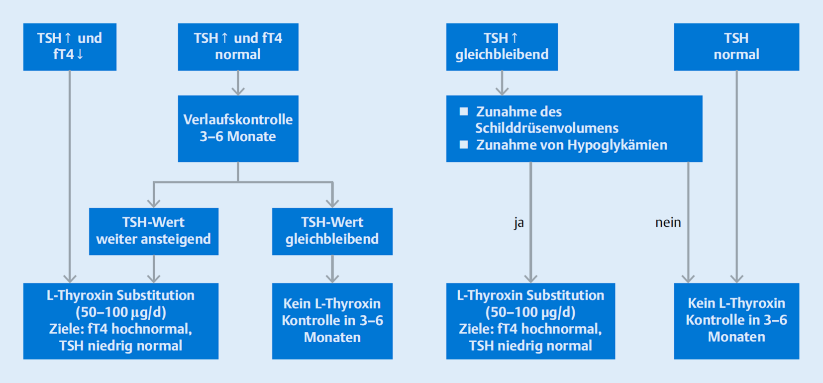 Die Therapie ist die Substitution von L‑Thyroxin (Abb. 1; [4]). Eine Laborkontrolle alle (3 bis) 6 Monate und auch eine regelmäßige sonographische Kontrolle der Schilddrüse (alle 1–2 Jahre, bei Knotenbildung häufiger) ist indiziert [2].