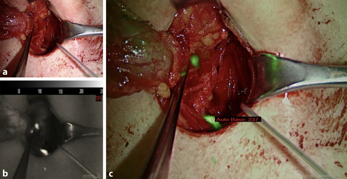 Erstmalig wurde die Anwendung der Overlay-Bildgebung mittels EleVision™ 2020 im Rahmen eines Case-Reports in Japan beschrieben. Hierbei beschränkte sich die Anwendung jedoch nicht auf die Darstellung der reinen Autofluoreszenz der Epithelkörperchen, sondern wurde im Rahmen einer ICG-gesteuerten Parathyreoidektomie eingesetzt. Hierbei kam vor allem die Schwellenwertfunktion zur Abgrenzung der Nebenschilddrüsen von dem umgebenden Schilddrüsengewebe zum Einsatz (Abb. 2; [7]). Aktuelle Studien zeigen, dass es durch die Verwendung von NIRAF, vor allem des Vorgängerprodukts Fluobeam 800® (Fluoptics®, Grenoble, Frankreich), zu einer einfacheren Lokalisierung der Nebenschilddrüsen, Reduktion der postoperativen Hypokalzämie und zu einer geringeren Anzahl an versehentlich resezierten Nebenschilddrüsen kommen kann [8‐13].