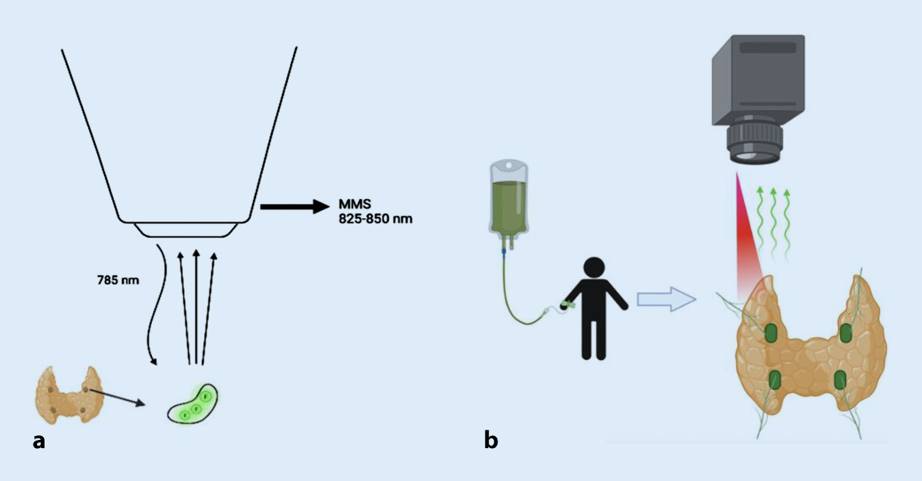 Die Overlay-Ansicht mittels EleVision™ (Medtronic, Minneapolis, MN, USA) stellt hierbei eine Weiterentwicklung der bisher eingesetzten Nahinfrarot-Autofluoreszenz (NIRAF)-Bildgebung dar, die sich von früheren Produkten durch eine automatische Anpassung der Intensität des Anregungslichtes sowie durch eine mögliche Änderung des Schwellenwerts und eine Nahinfrarot-Weißlicht-Überlagerung unterscheidet. Hierbei wird während der Messung, nach Aktivierung des Dioden-Lasers, Licht mit einer Wellenlänge von 785 nm auf die zu lokalisierende Nebenschilddrüse ausgesendet. Nach Anregung der endogenen Fluorophore werden Lichtsignale des Farbstoffs an das Miniaturmikroskop (MMS), welches ein Emissionsspektrum von 825 bis 850 nm umfasst, ausgesendet und aufgefangen. Somit entstehen drei unterschiedliche Bildansichten zur Darstellung der Nebenschilddrüsen: Die Weißlicht‑, Nahinfrarot- und die Overlay-Ansicht (Abb. 1).