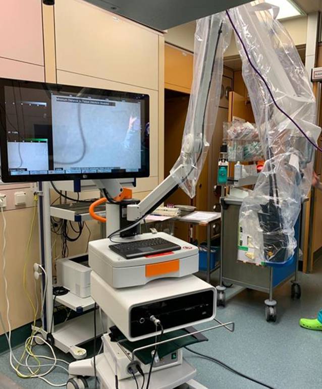 Das chirurgische Vorgehen und die Größe eines minimal-invasiven Schnitts von 3 bis 5 cm blieben hierbei unverändert. Der wesentliche Unterschied besteht in der intraoperativen Platzierung und Anwendung der EleVision™. Dafür werden Kamerakopf und -arm steril überzogen und an den Operationstisch herangeführt (Abb. 3). Während der Messung werden LED-haltige OP-Lichter ausgeschaltet, da es sonst zu einer Verfälschung der Messungen kommen kann.