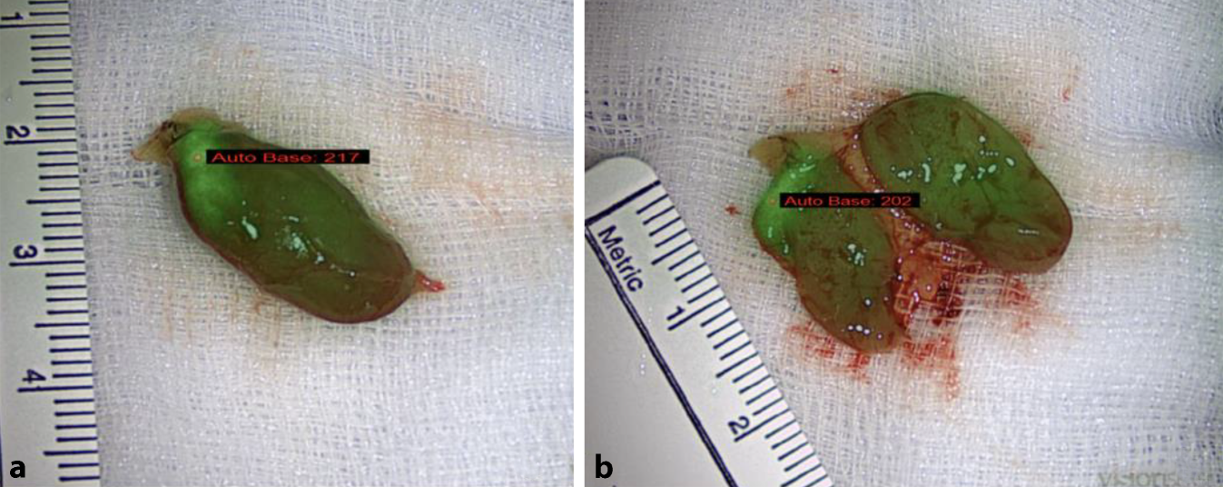 Inhomogenes Autofluoreszenzmuster von Nebenschilddrüsenadenomen. a Adenom in gesamter Ausprägung, b Adenomschnittfläche